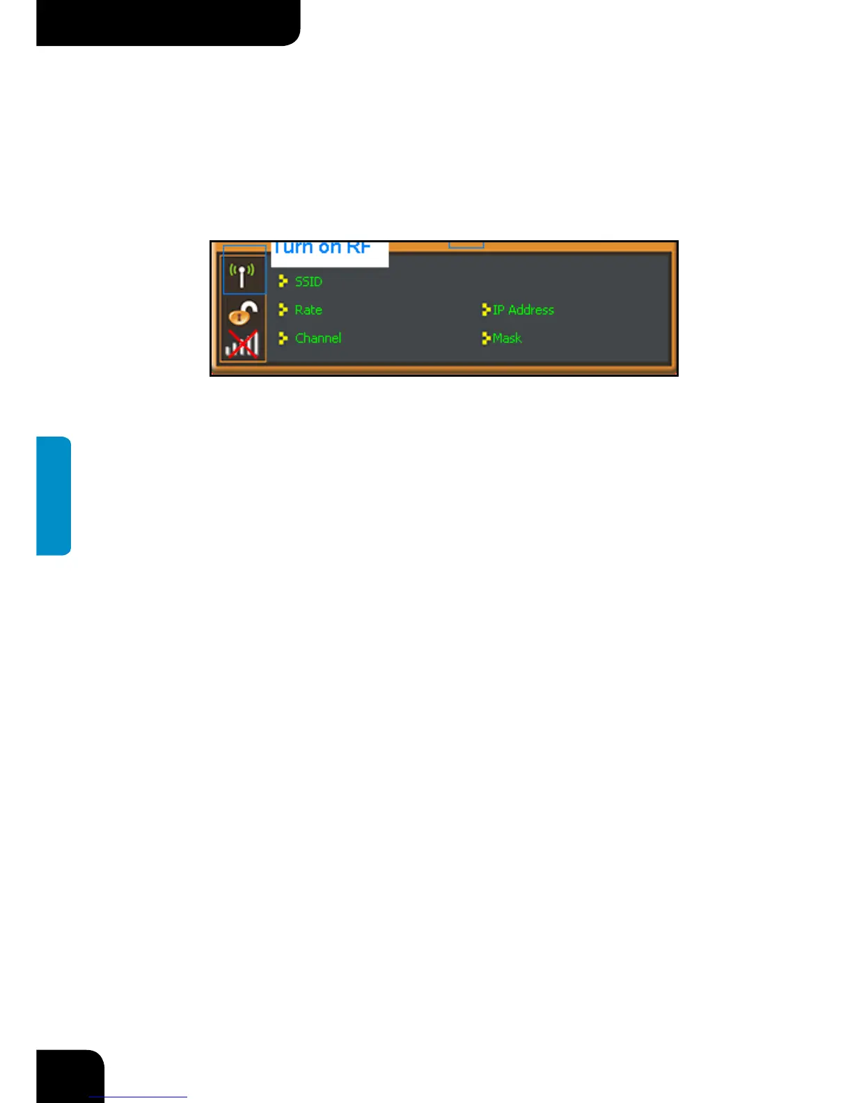 Ayuda y Minimizar. Mientras que la columna izquierda muestra Encender/Apagar RF,