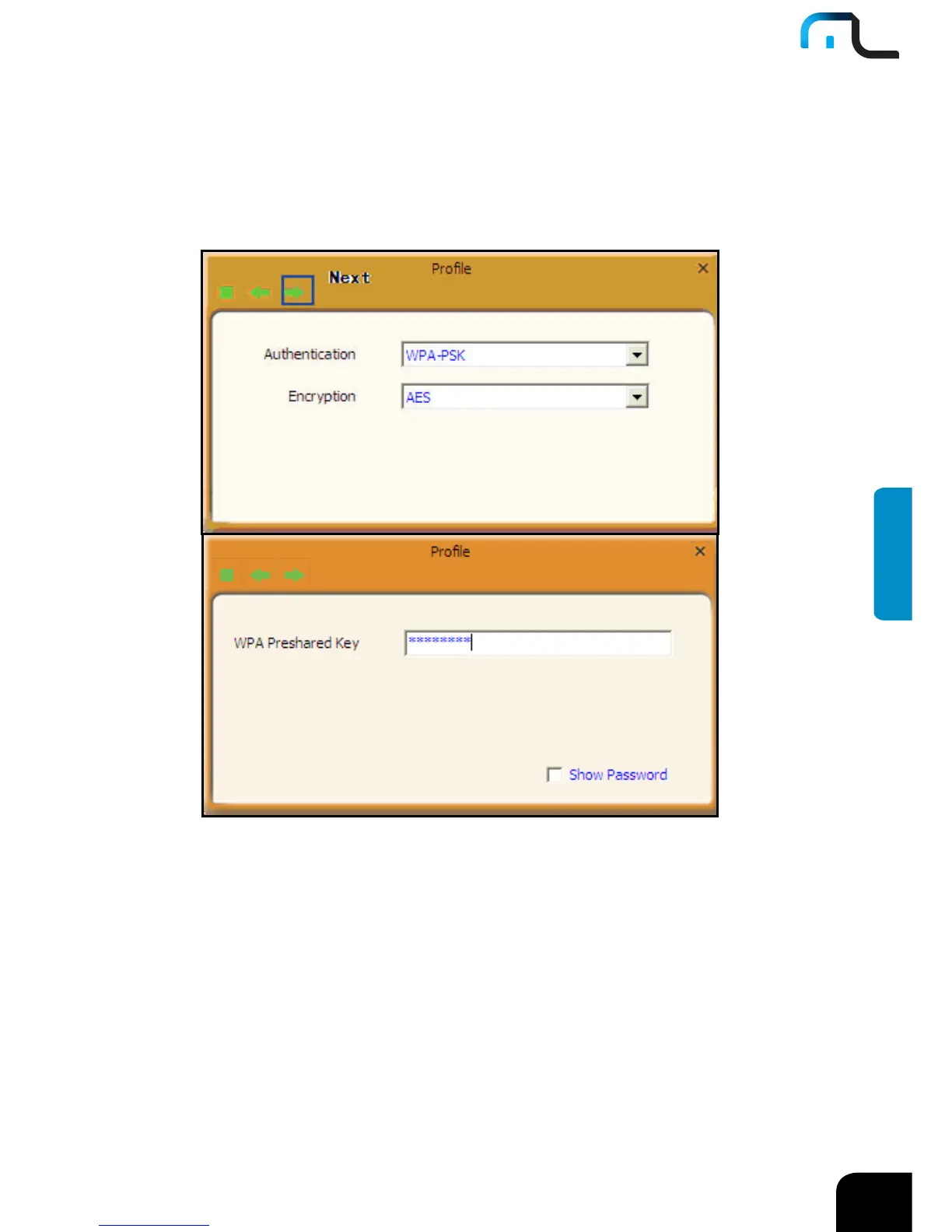 encriptación como WPA - PSK y AES, y luego ingrese la clave y haga clic en siguiente.