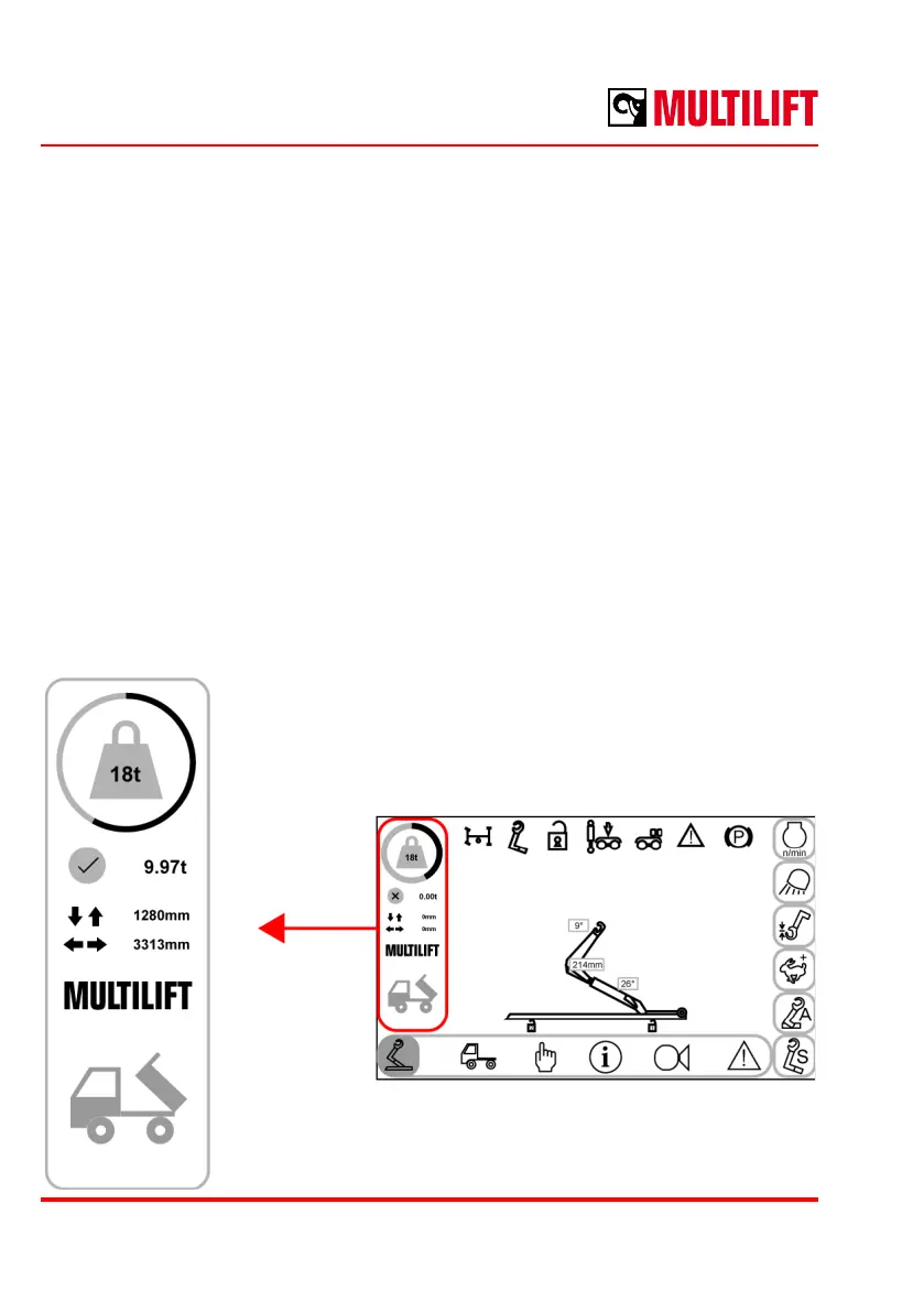 a circle. Overload turns circle red. Hooklift nominal capacity is shown in the centre of circle.