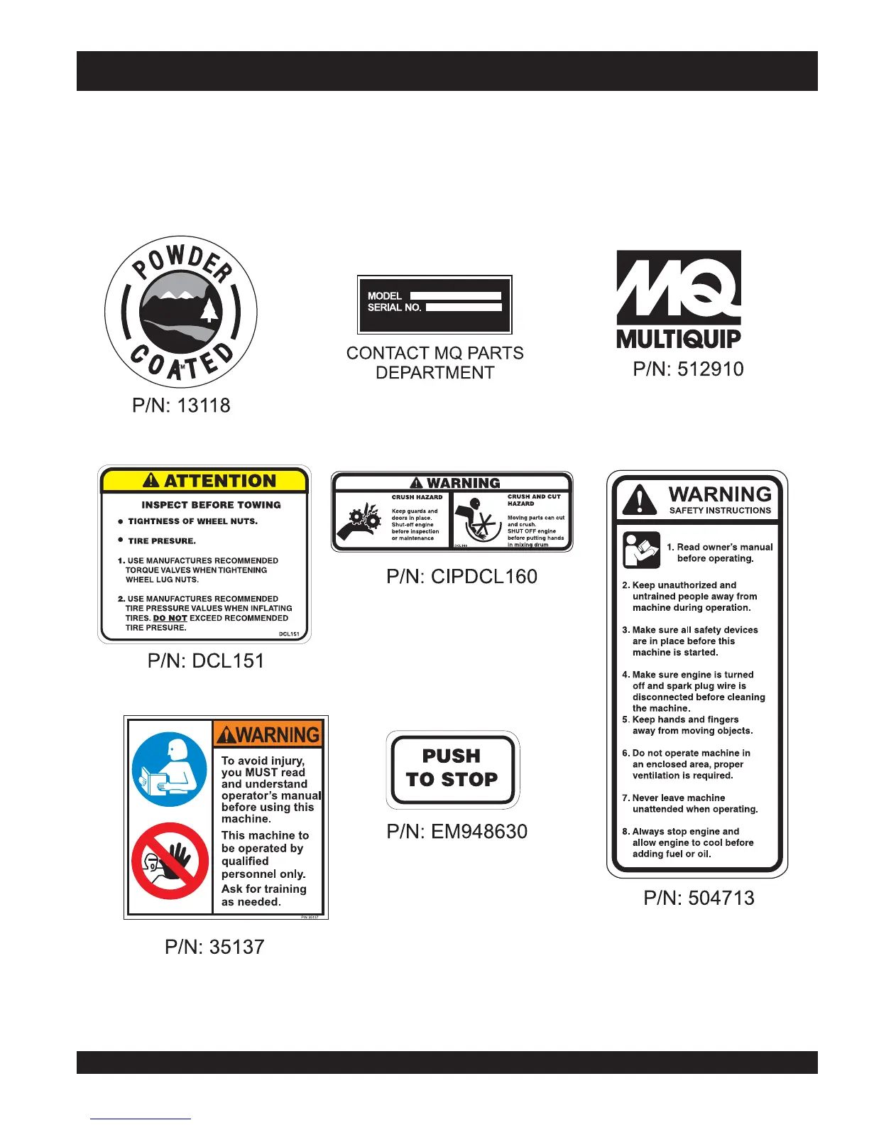 The Multiquip MC94P/S mixers are equipped with a number of safety decals (Figure 1A). These decals are provided for operator