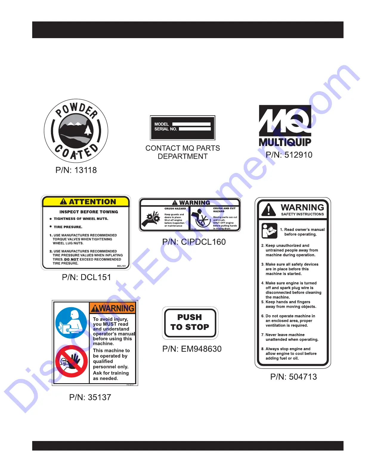 The Multiquip MC94P/S mixers are equipped with a number of safety decals (Figure 1A). These decals are provided for operator