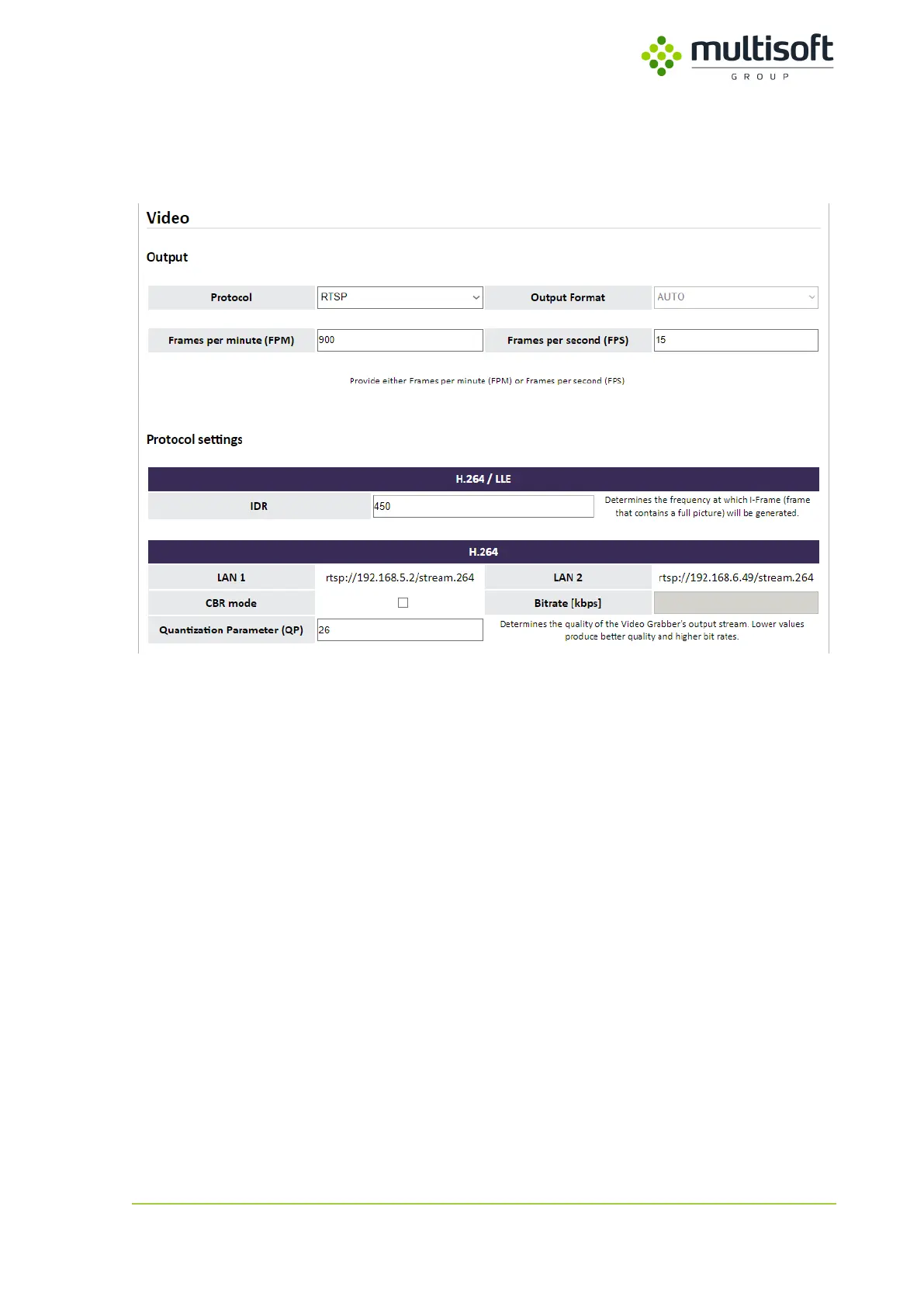Figure 33: Sample configuration of Video Grabber set to stream captured video signal (H.264 VBR)