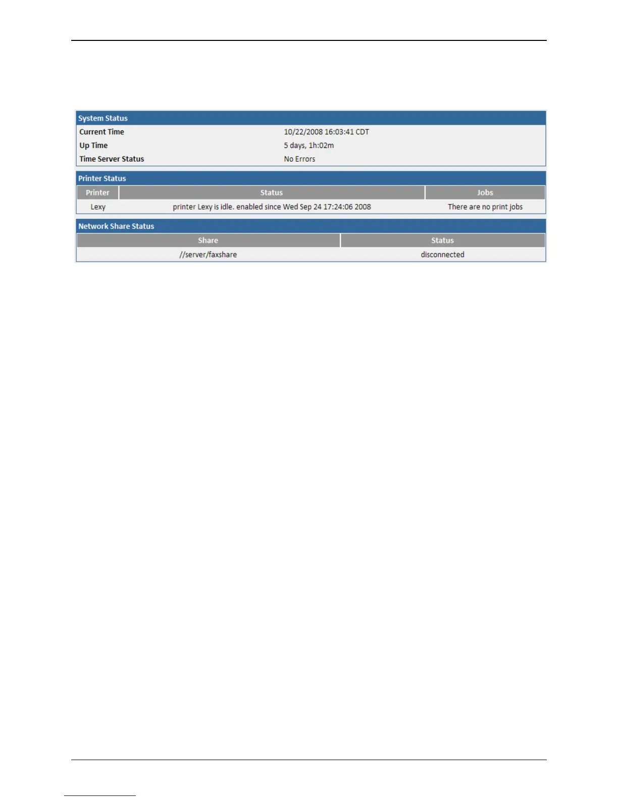 This displays the current status of any network shares that have been configured in the System
