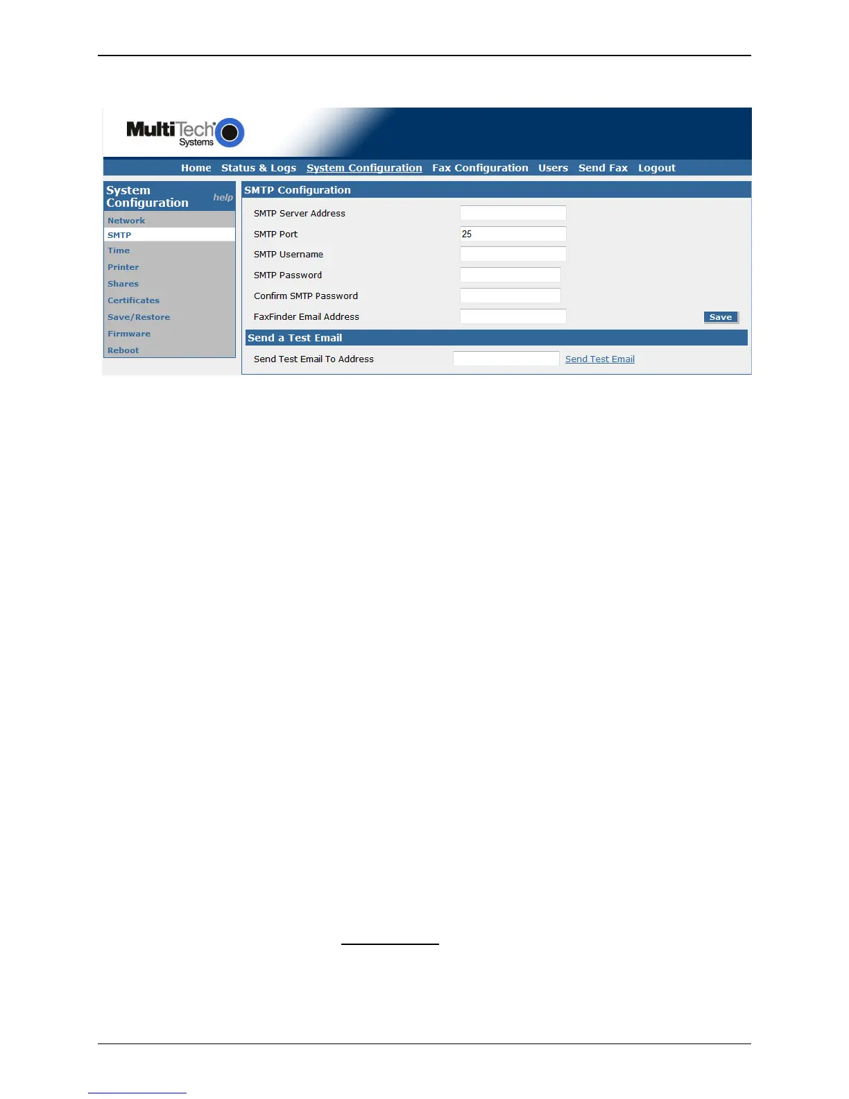The SMTP section contains the information needed to setup email usage with the FaxFinder, as well as a