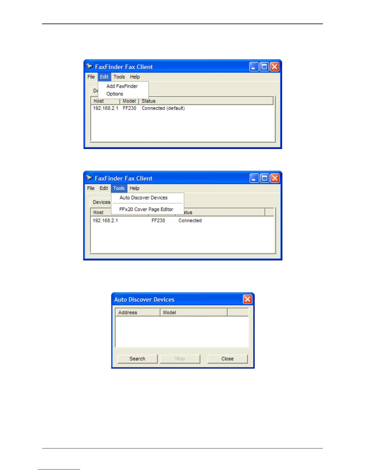 “Auto-Discover Devices” to have the Client software search the network for FaxFinder units.