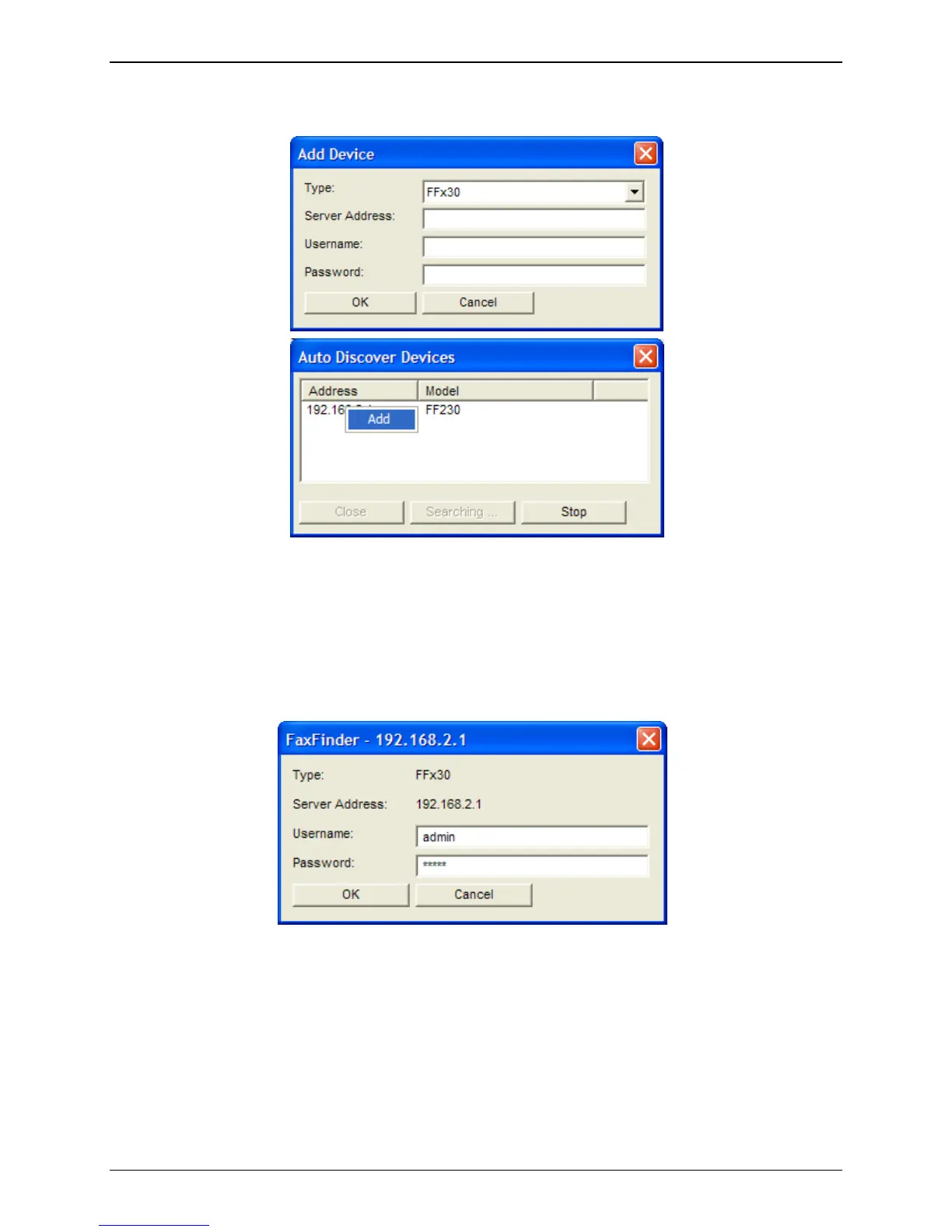 click on the IP address or name of the FaxFinder unit that was detected. Use the ‘X’ in the upper right