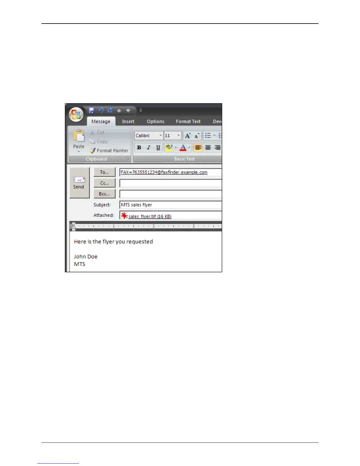 1. In the To: field, enter the recipients in this format: FAX=phone number of recipient fax