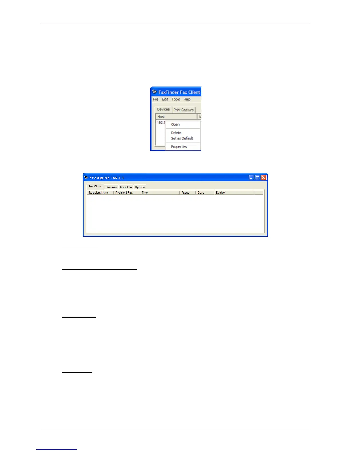 of the FaxFinder unit) and Status (displays the connection state of the FaxFinder unit as well as showing