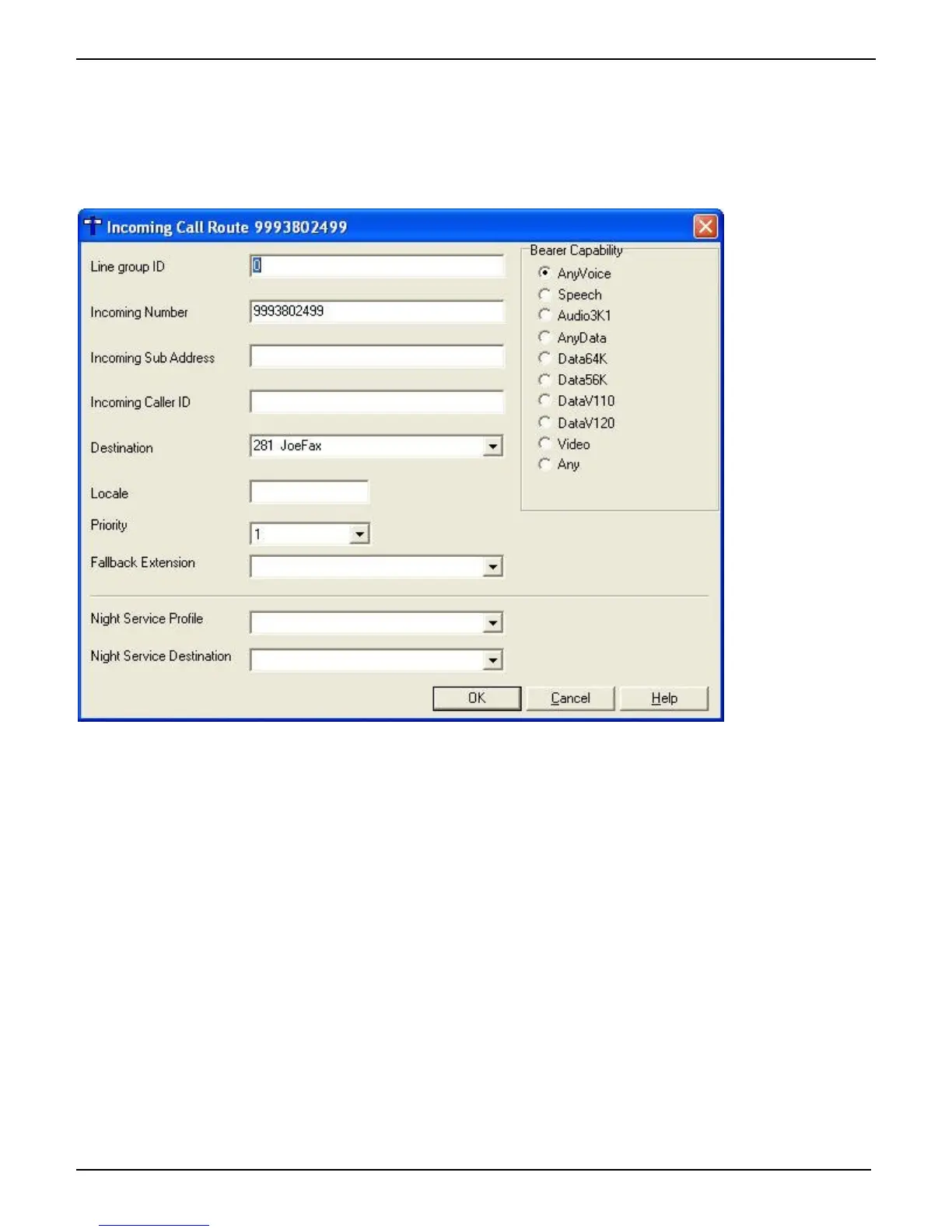 “Incoming Number” with an available “Destination.” Then click OK. When the external caller dials the 9993802499