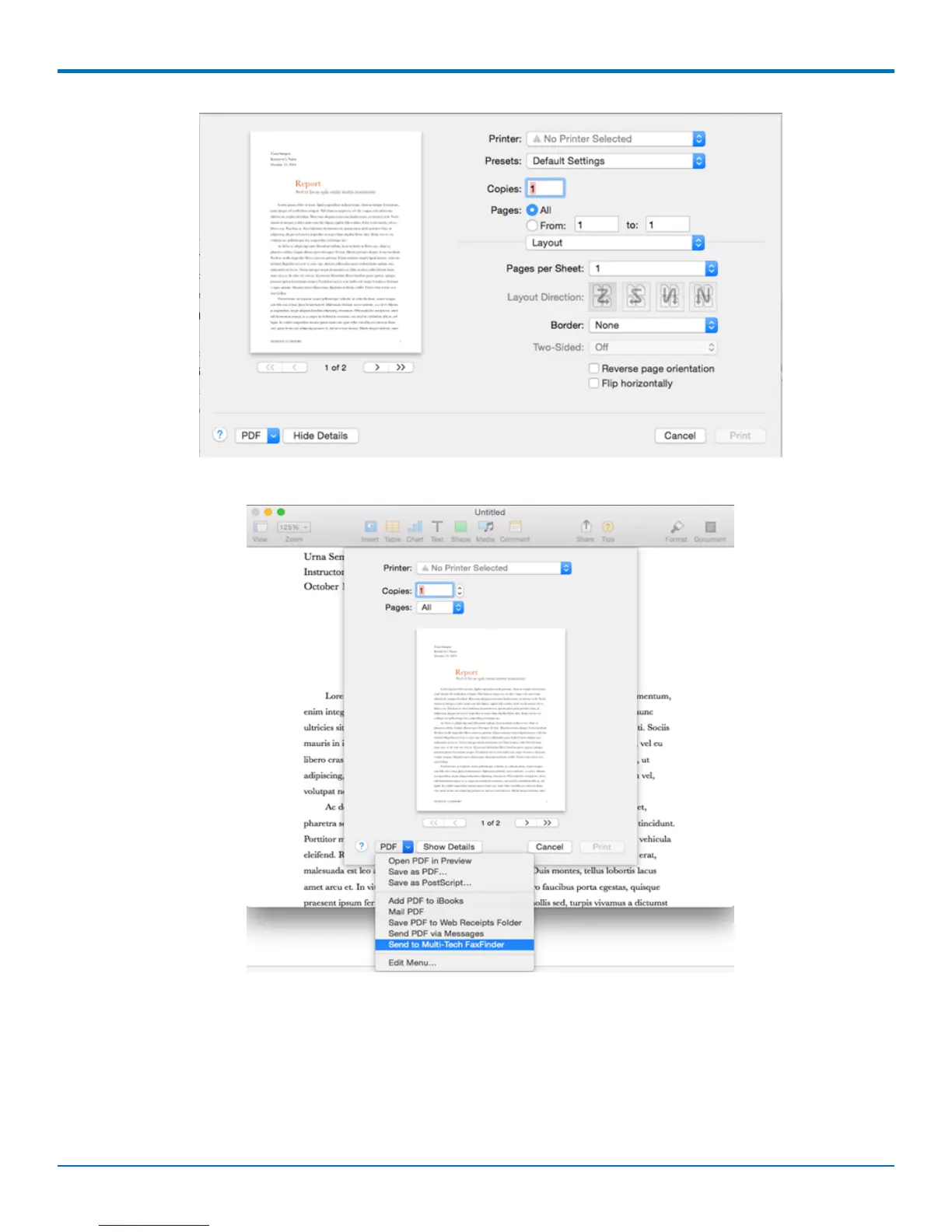 3. Open the PDF drop-down list in the lower left corner and select Send to Multi-Tech FaxFinder. The