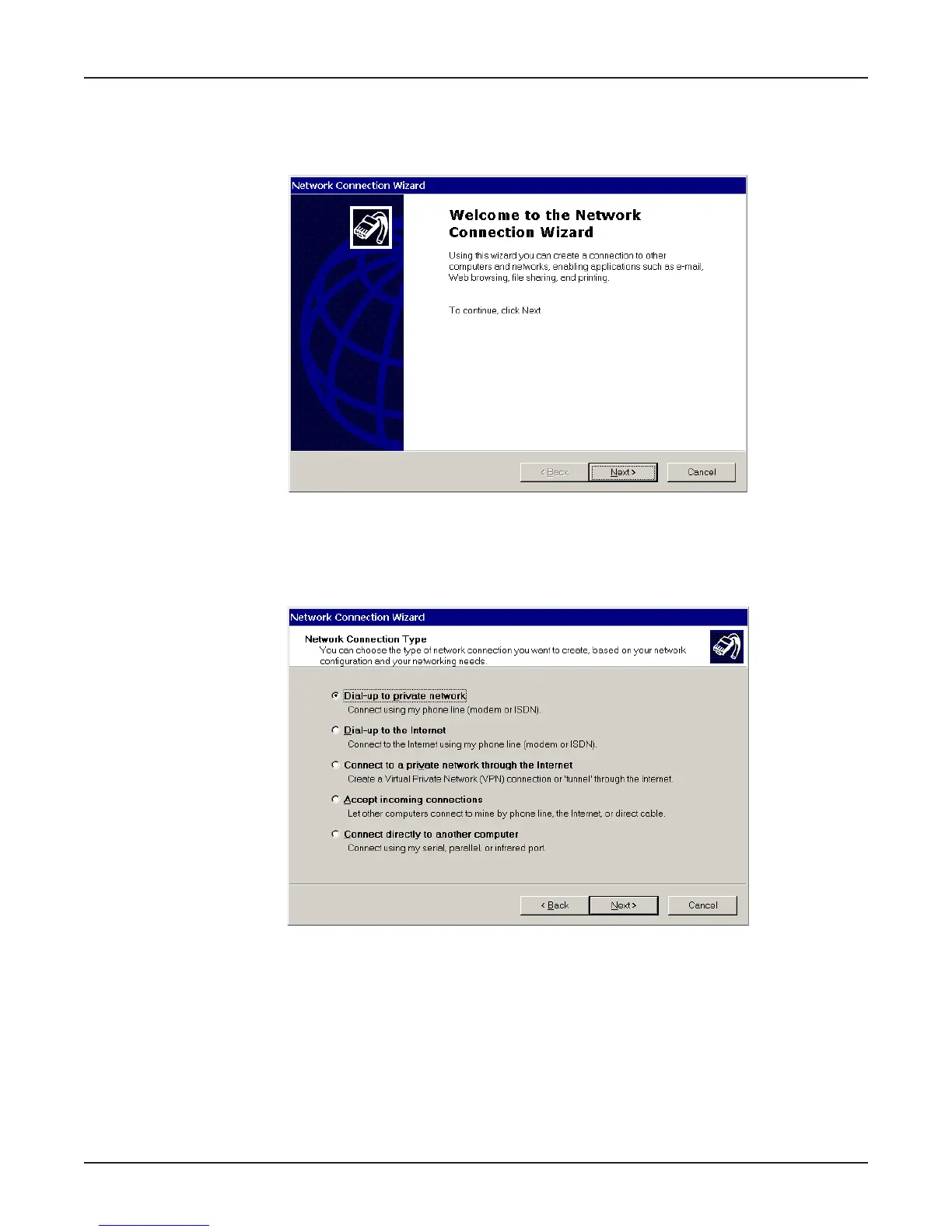 icon. The Network Connection Wizard dialog box is displayed indicating the Wizard will help in