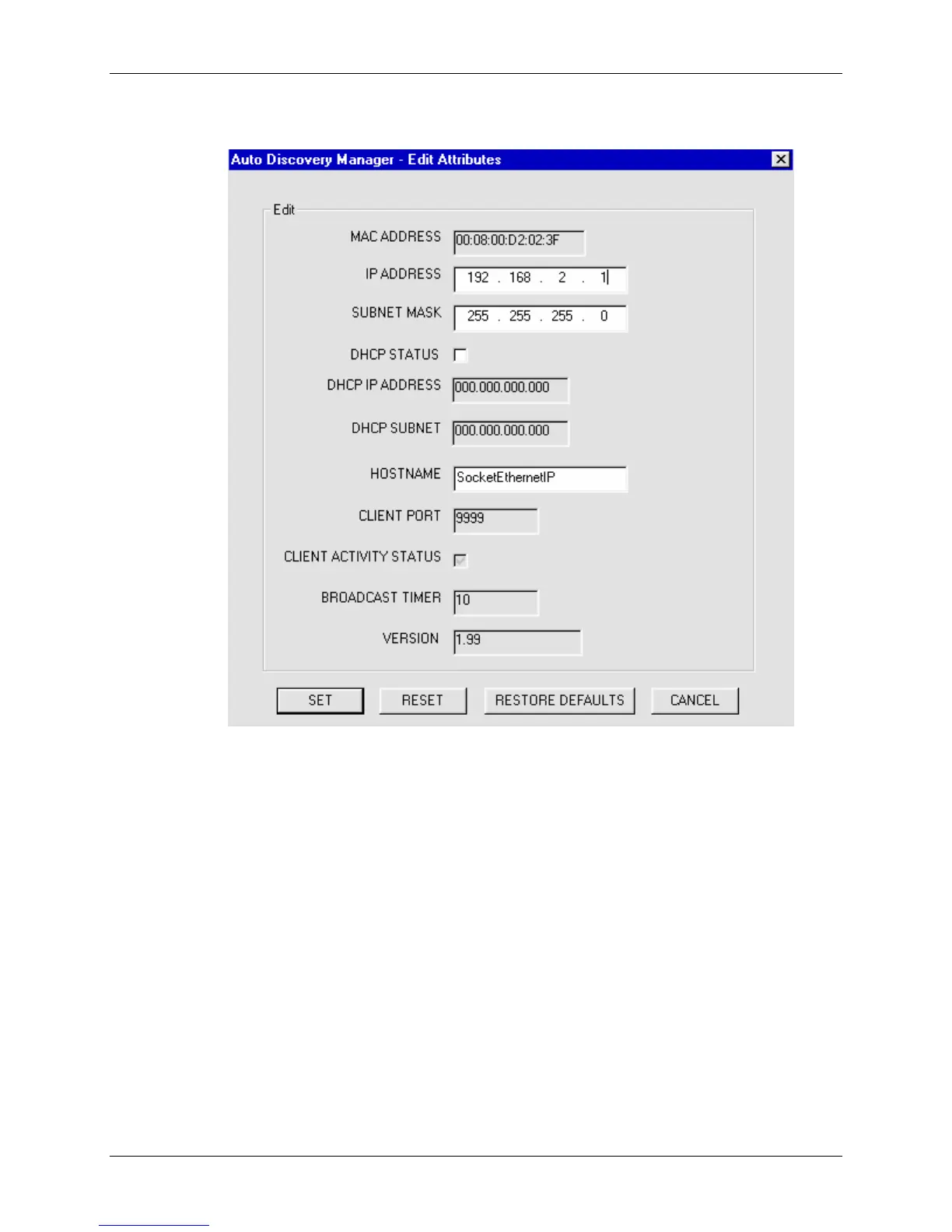 3. Enter the new parameters and click the SET button. The server sends the modified parameters
