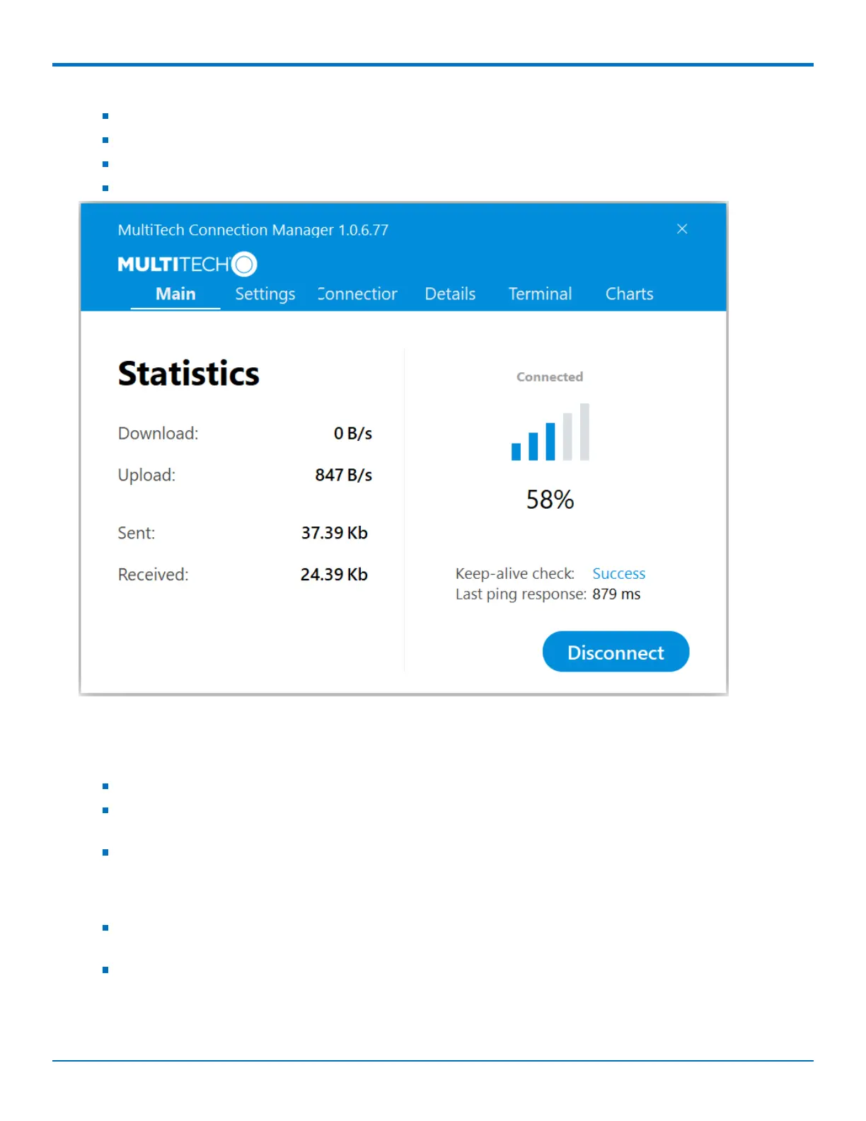 Connection statistics: download and upload speeds, amount of traffic sent and received (only when
