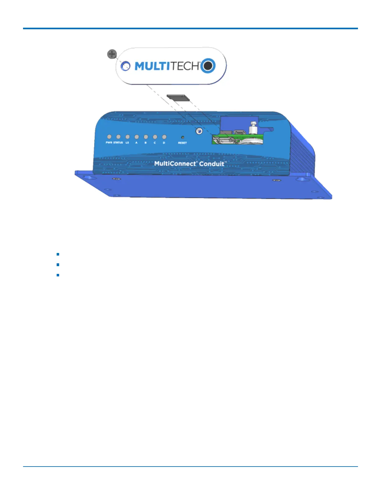 2. At the front of the Conduit housing, remove the screw that secures the MultiTech nameplate to the
