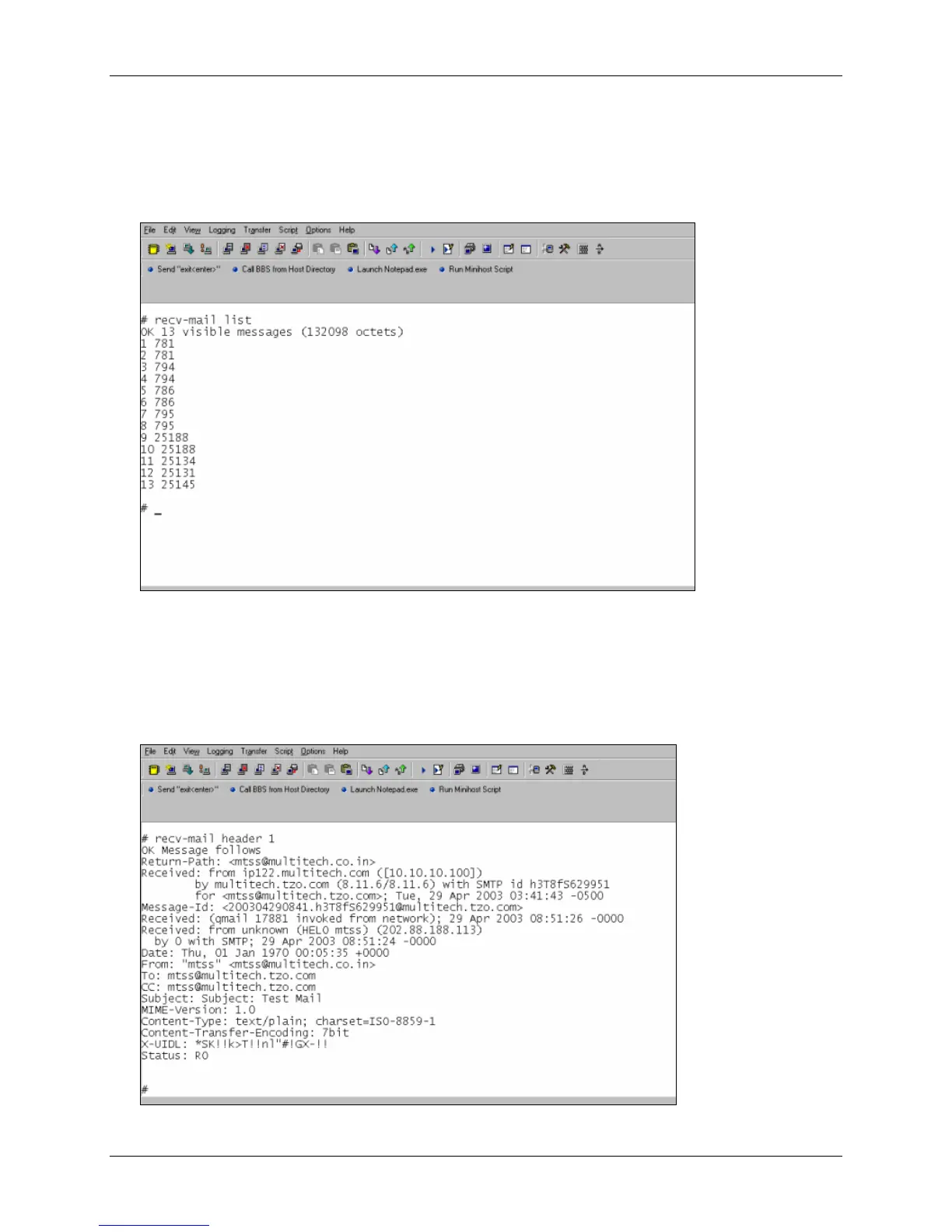 Use the command recv-mail header to retrieve the message header of all emails. The output is multi-