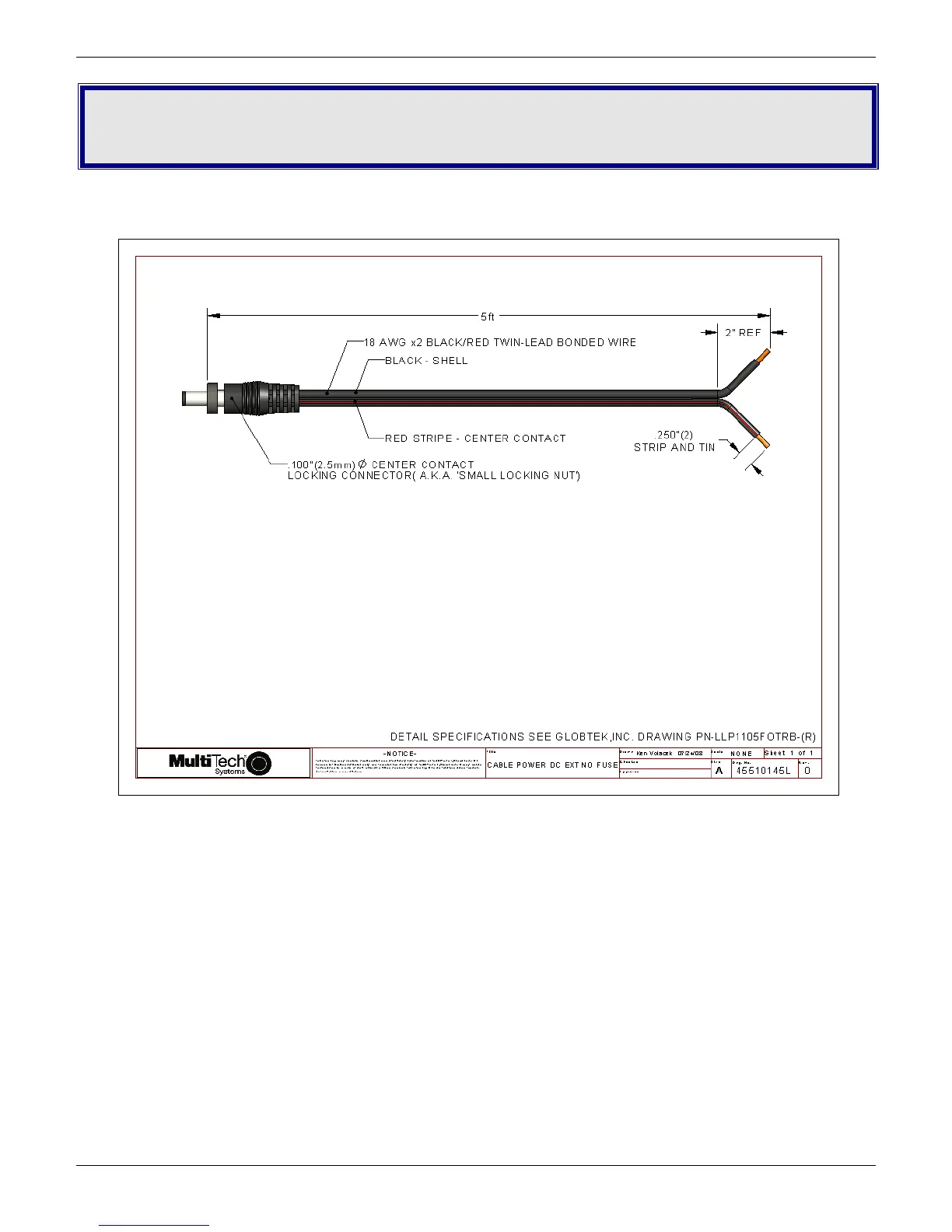Multitech MultiModem Cell MTCBA-E1 - Appendix C - DC Power Cable; DC Power Cable Dimensions