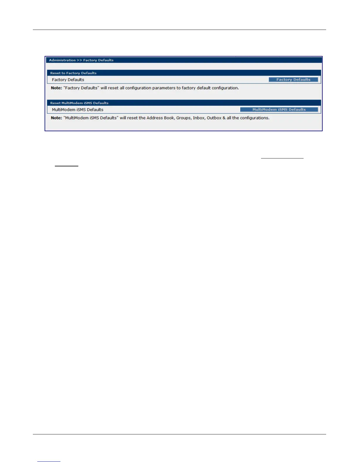 Note: The back panel Reset button performs the same function as the "MultiModem iSMS Defaults"