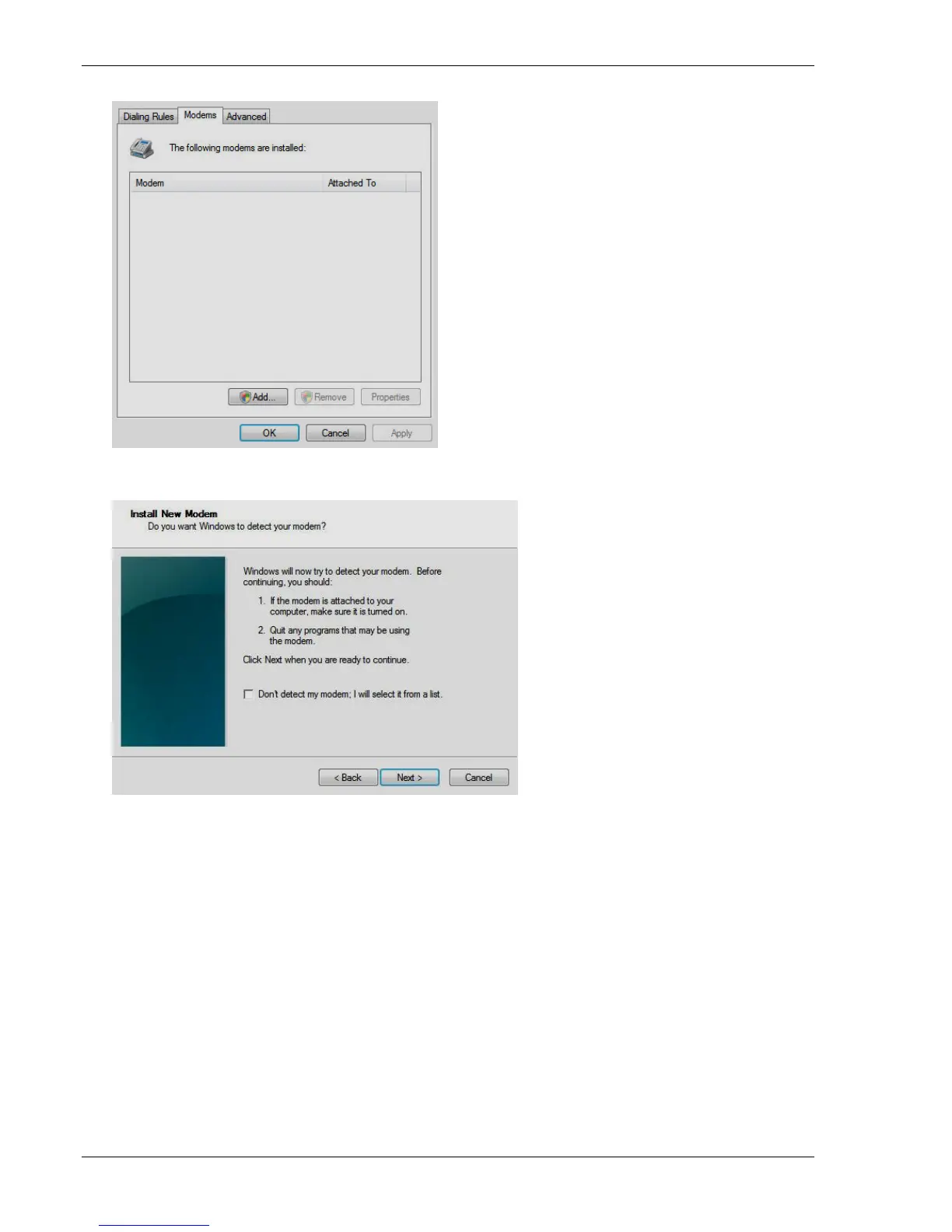 5. On the Install New Modem panel, click Don’t detect my modem, I will select it from a list.