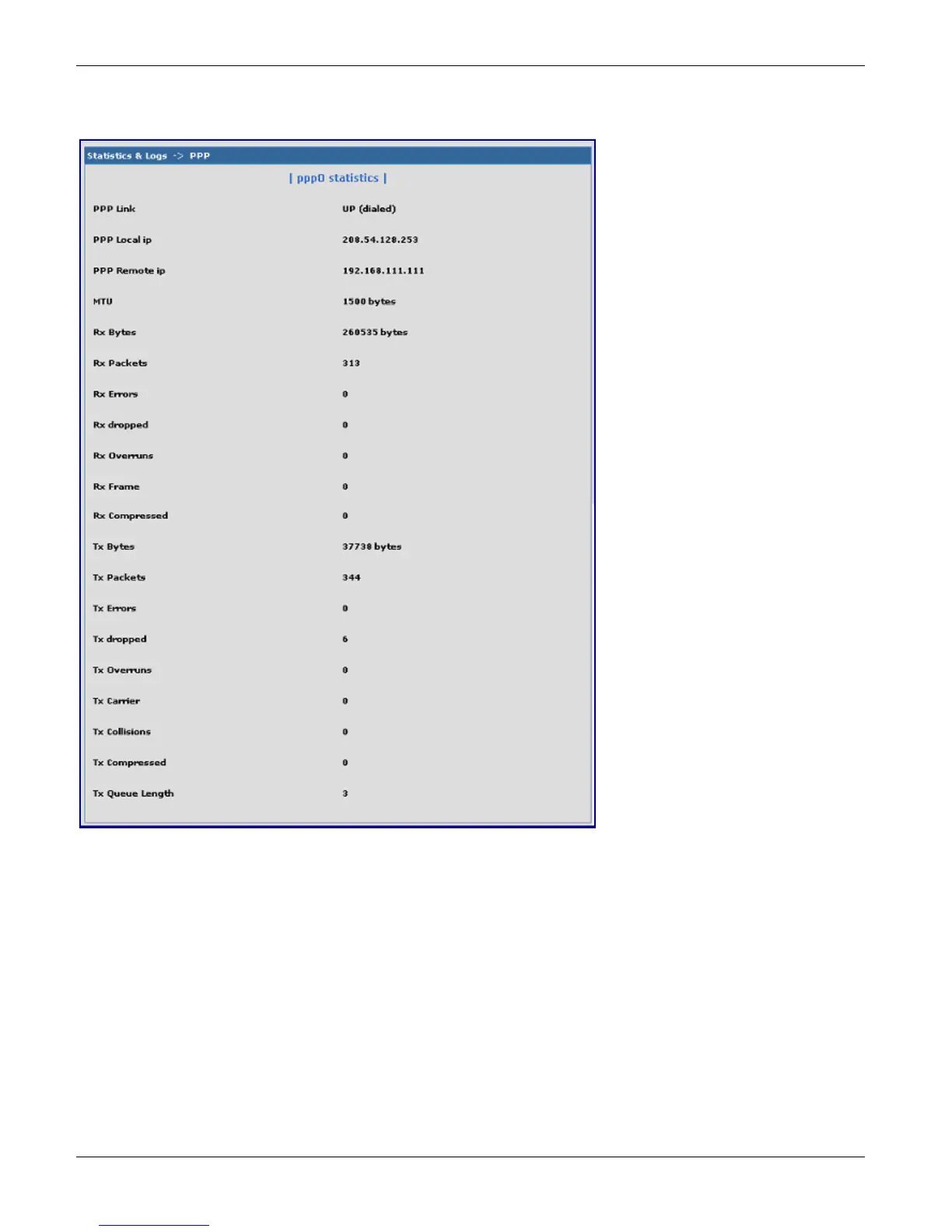 This is an example of the PPP Statistics & Logs page. It shows PPP statistics when PPP is enabled.
