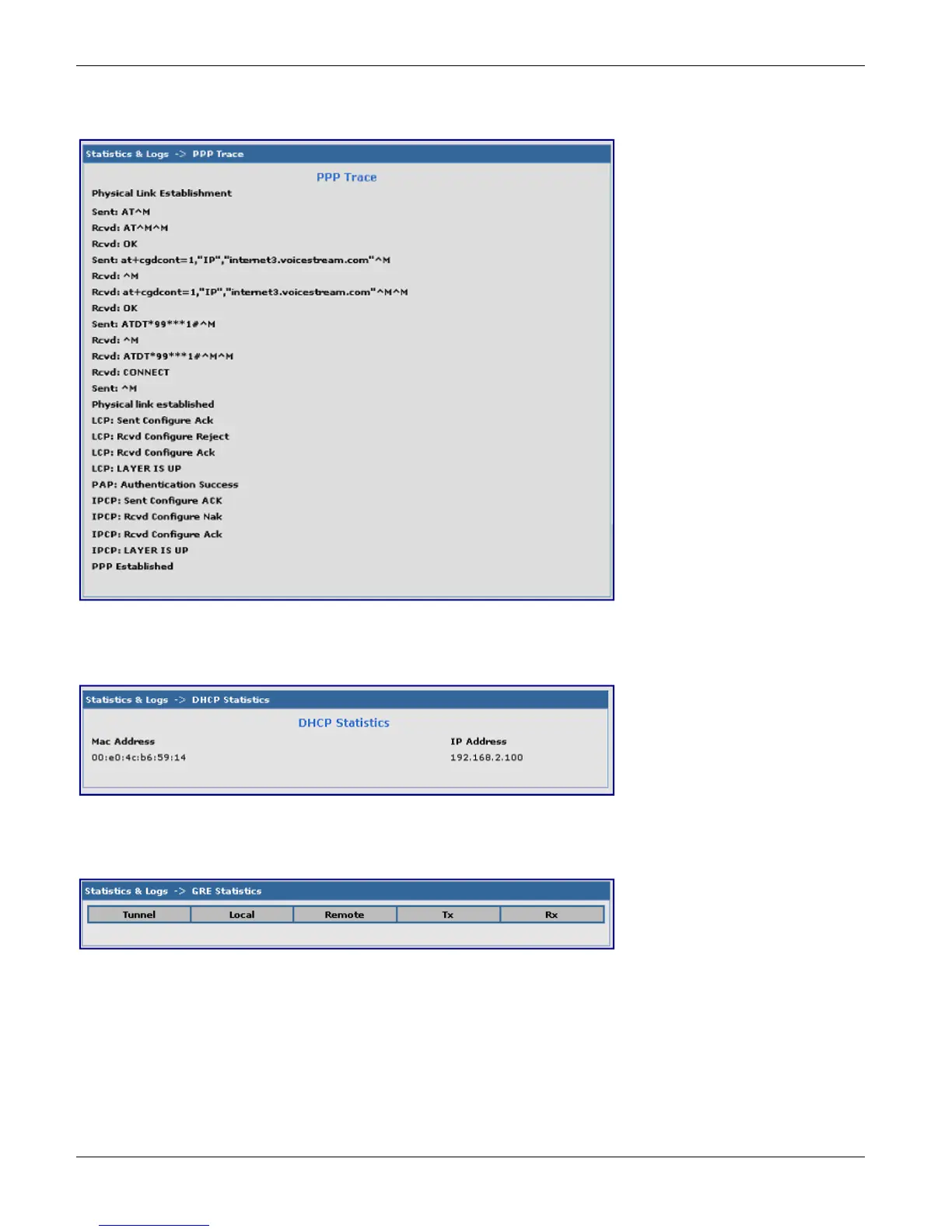 This is an example of the PPP Trace Statistics & Logs page. It shows the PPP trace messages.