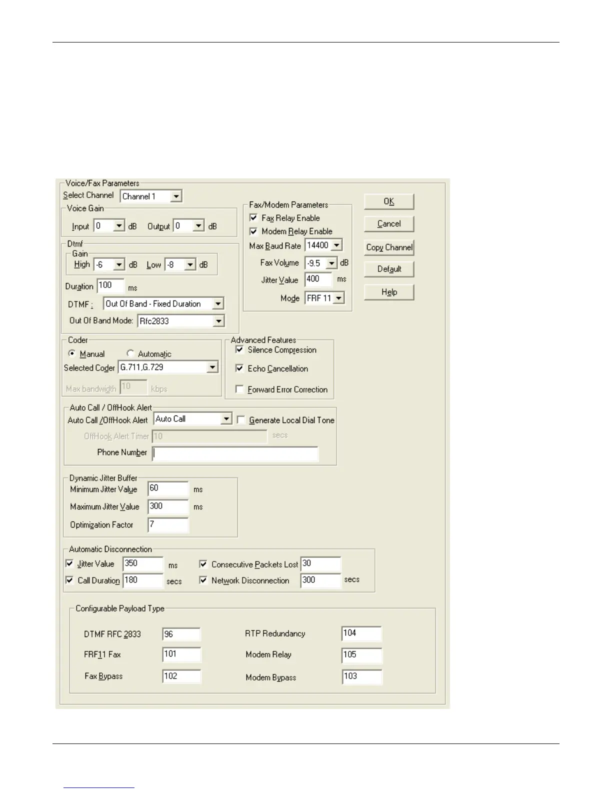 by using the Copy Channel button and its dialog box. To copy a set of Voice/FAX parameters to all channels,