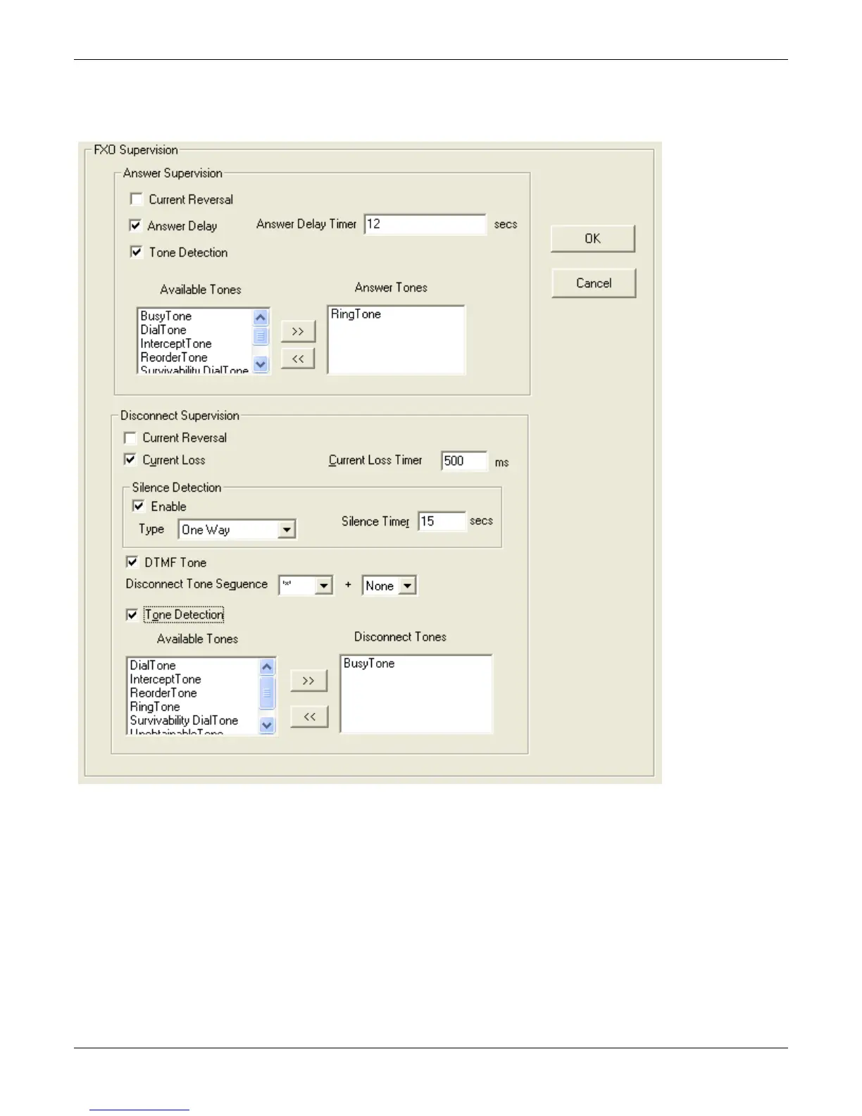 The table that follows describes the settings for FXO Supervision.