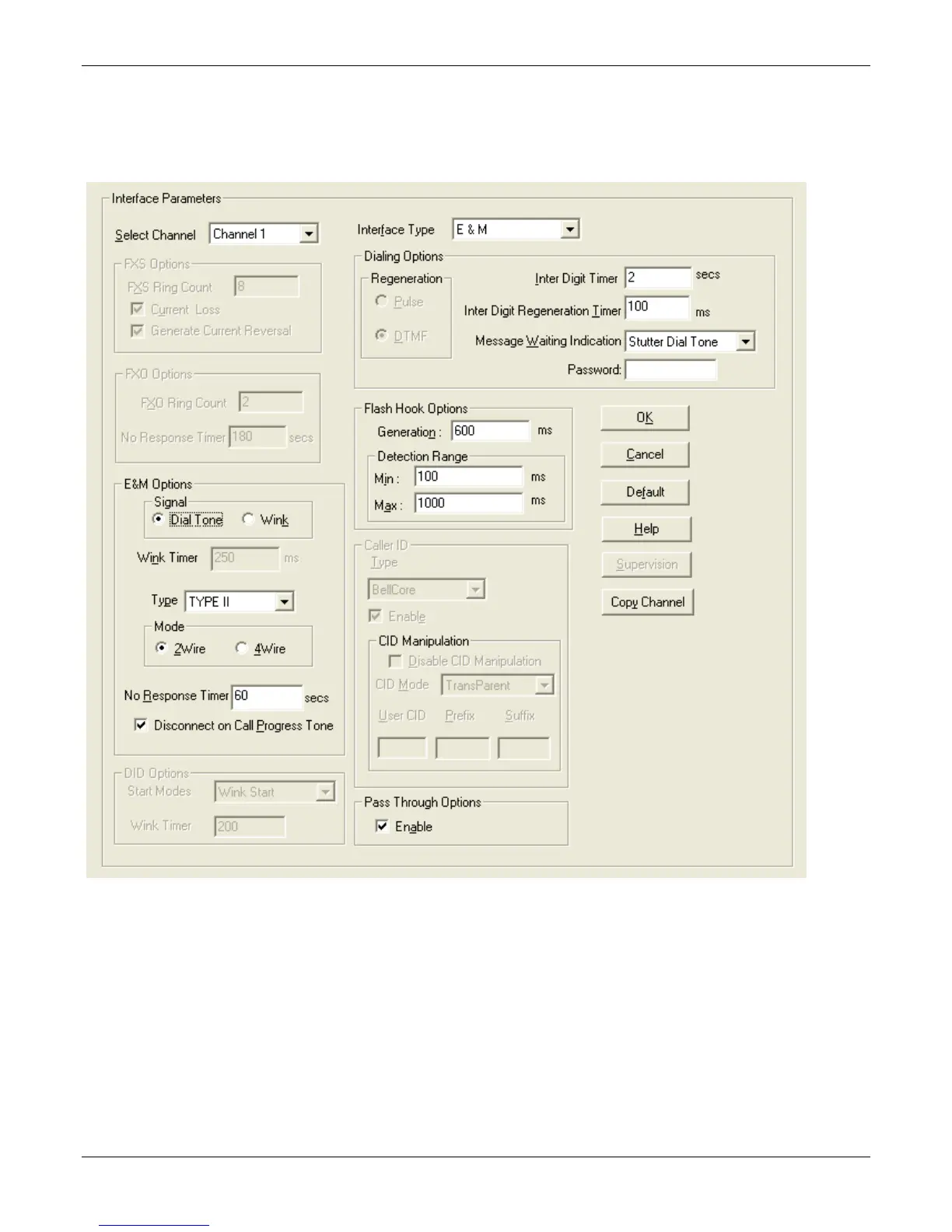 The parameters applicable to the E&M telephony interface type are shown in the figure and described in the