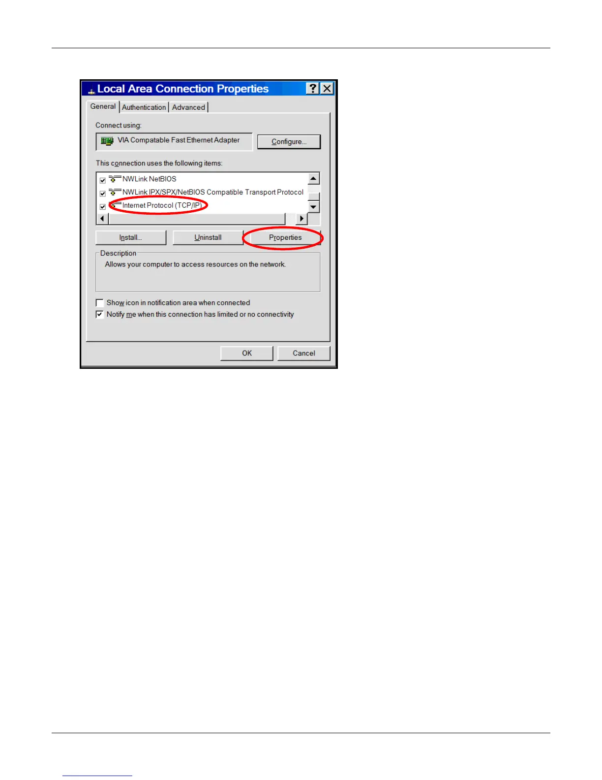 • Click the Properties button. The Internet Protocol (TCP/IP) Properties screen displays.