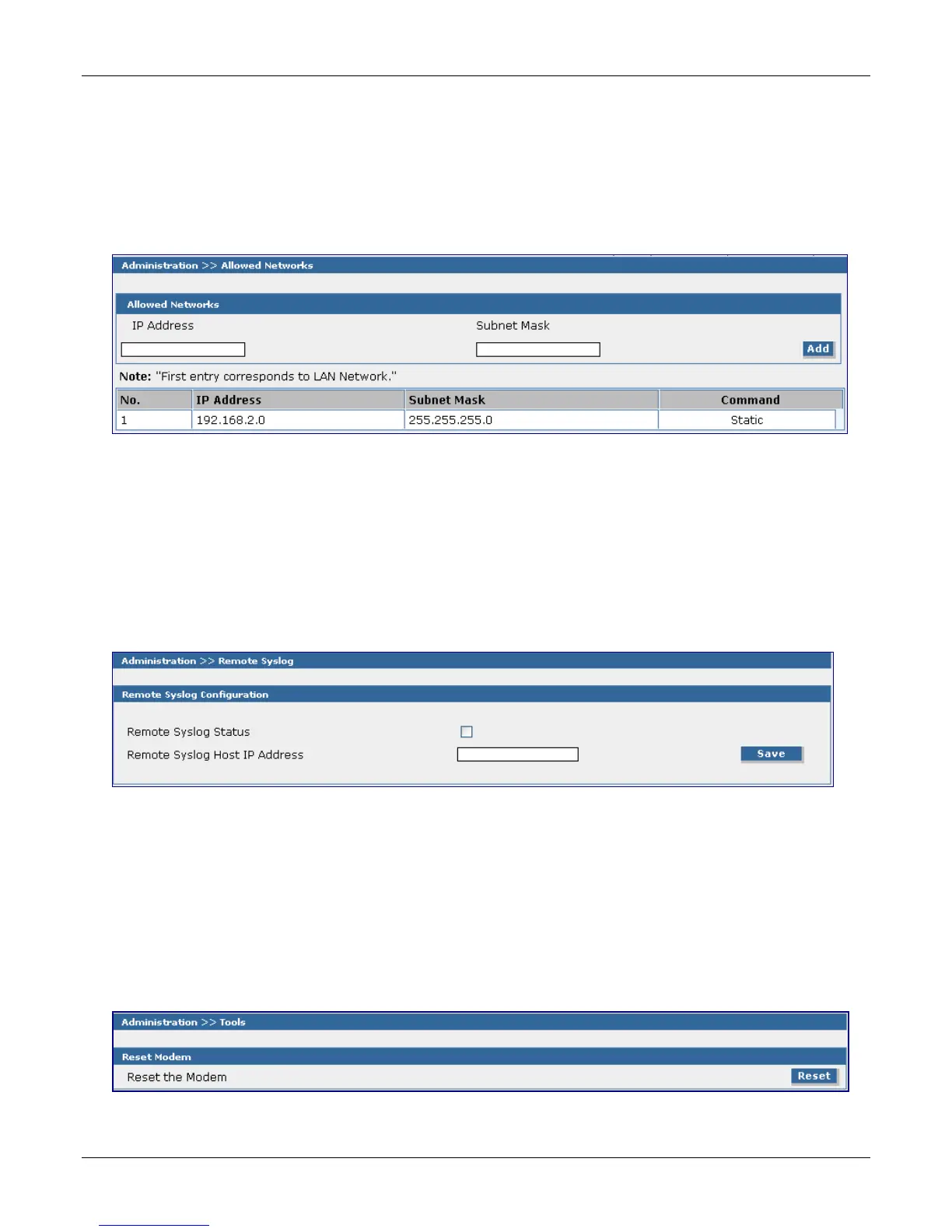 Use this screen to set the networks that will be allowed access to the SMSFinder's WEB GUI, Telnet Dialout,