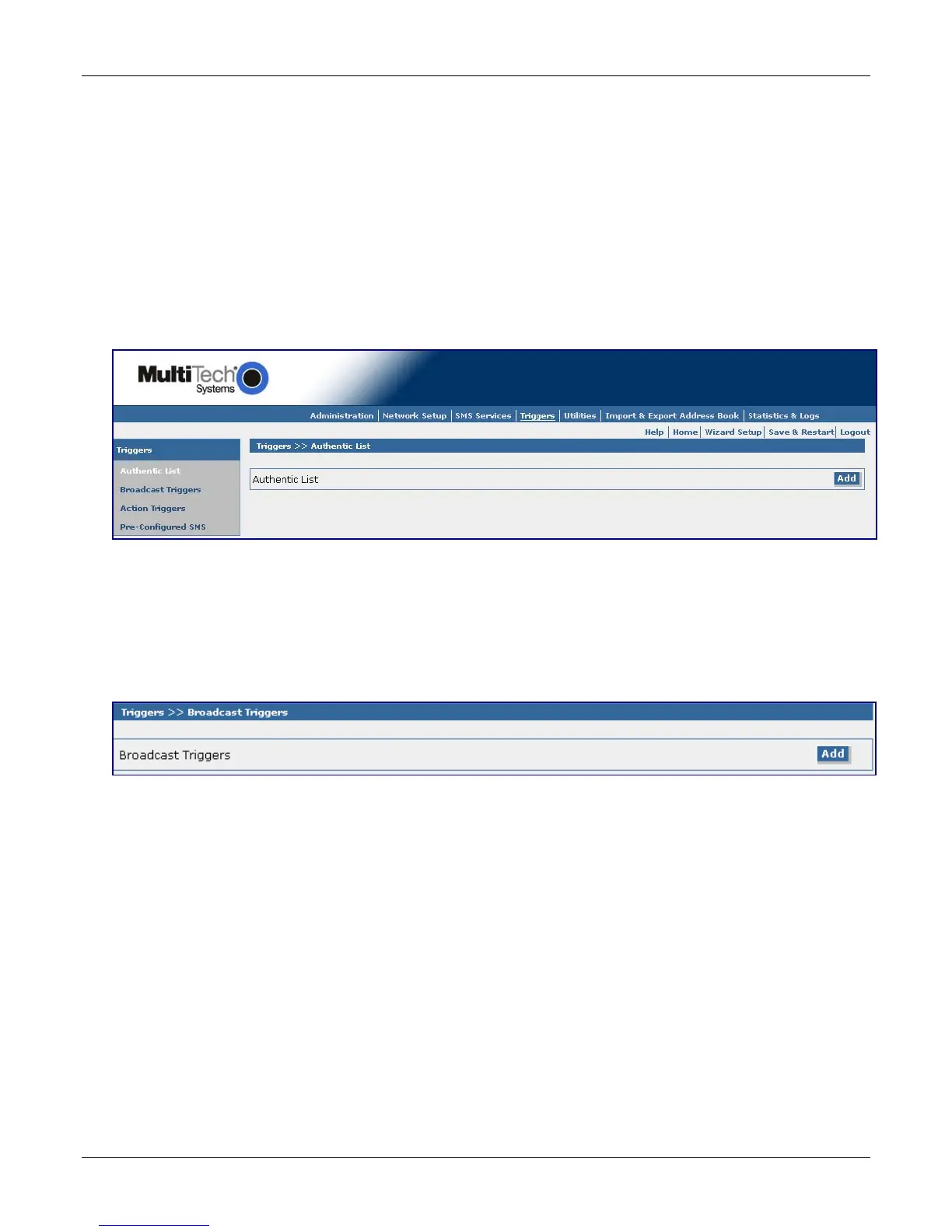 Use this screen to set up trigger messages, broadcast messages, and authentication parameters.