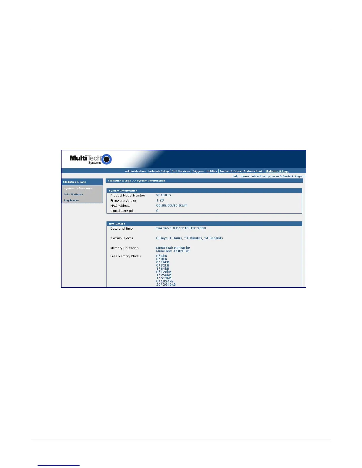 Multitech SF100-G - Statistics & Logs; Statistics & Logs > System Information