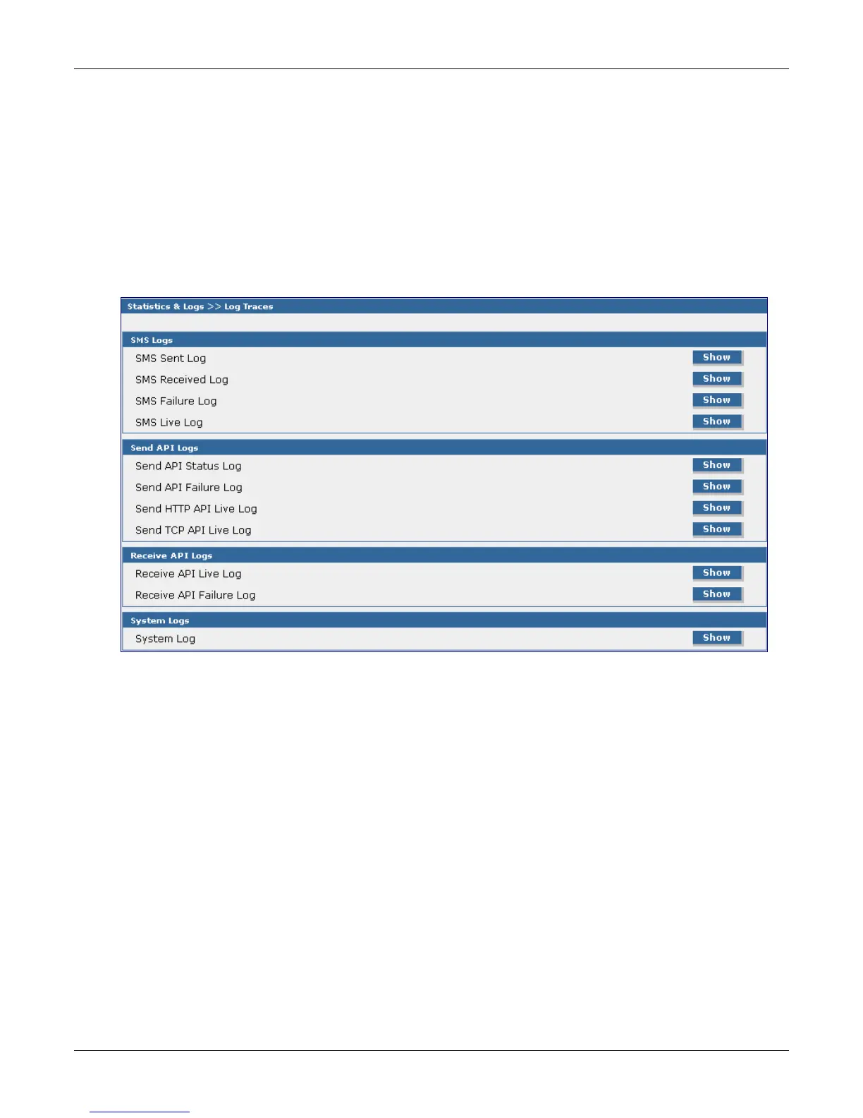 The Log Traces screen provides detailed information about SMS messages, API functions, and the SMS
