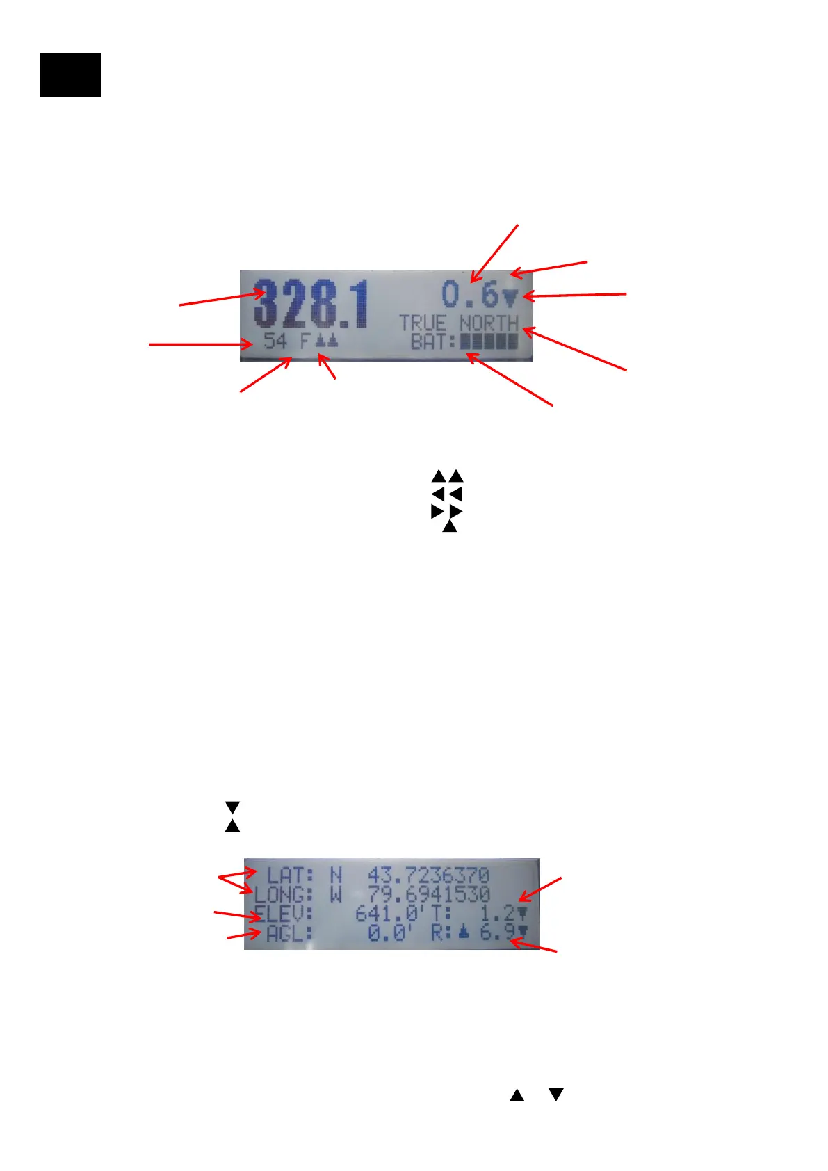 down arrow on the User Interface) displays the GPS coordinates, Elevation, Tilt, Tilt Direction, Roll, Roll Direction, and