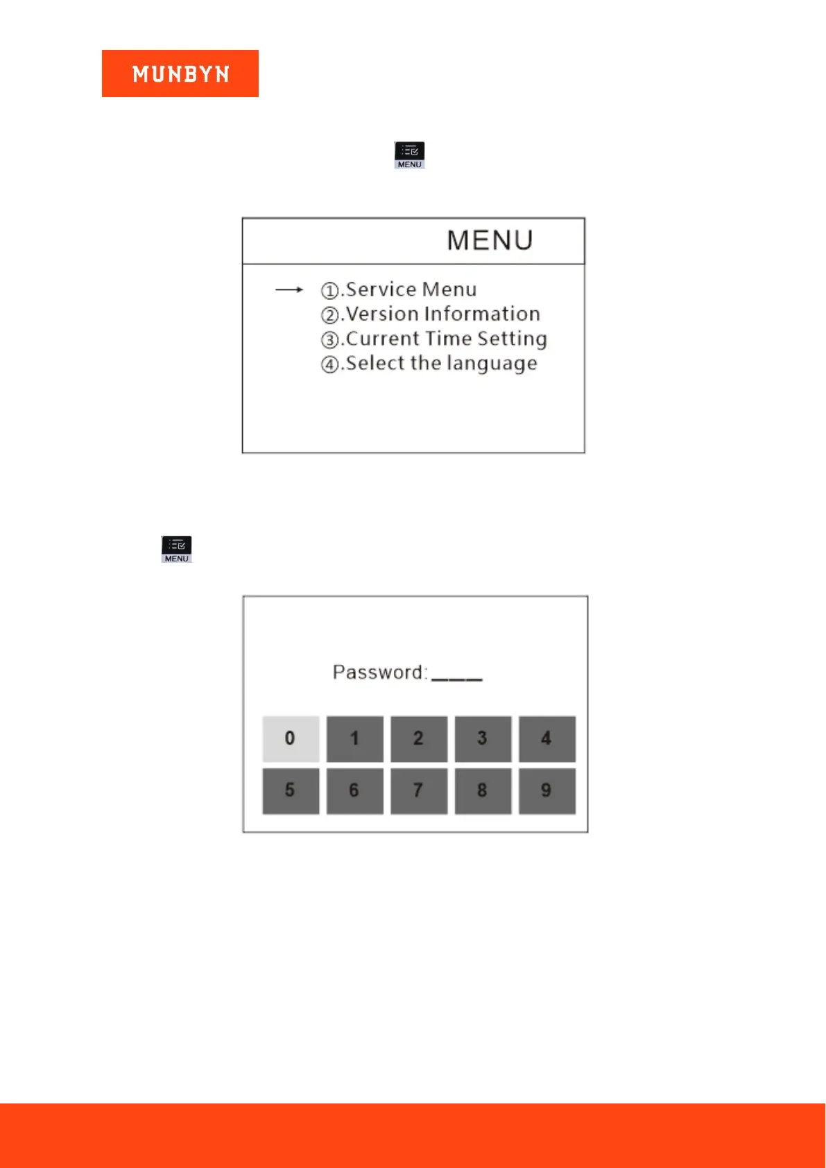 Press the key to enter service menu, you will be requested to input a password with the following