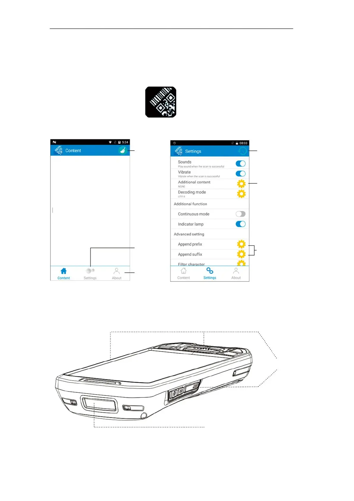 2.In the ‘Content’ of app, you can press scan button to test the barcoding.