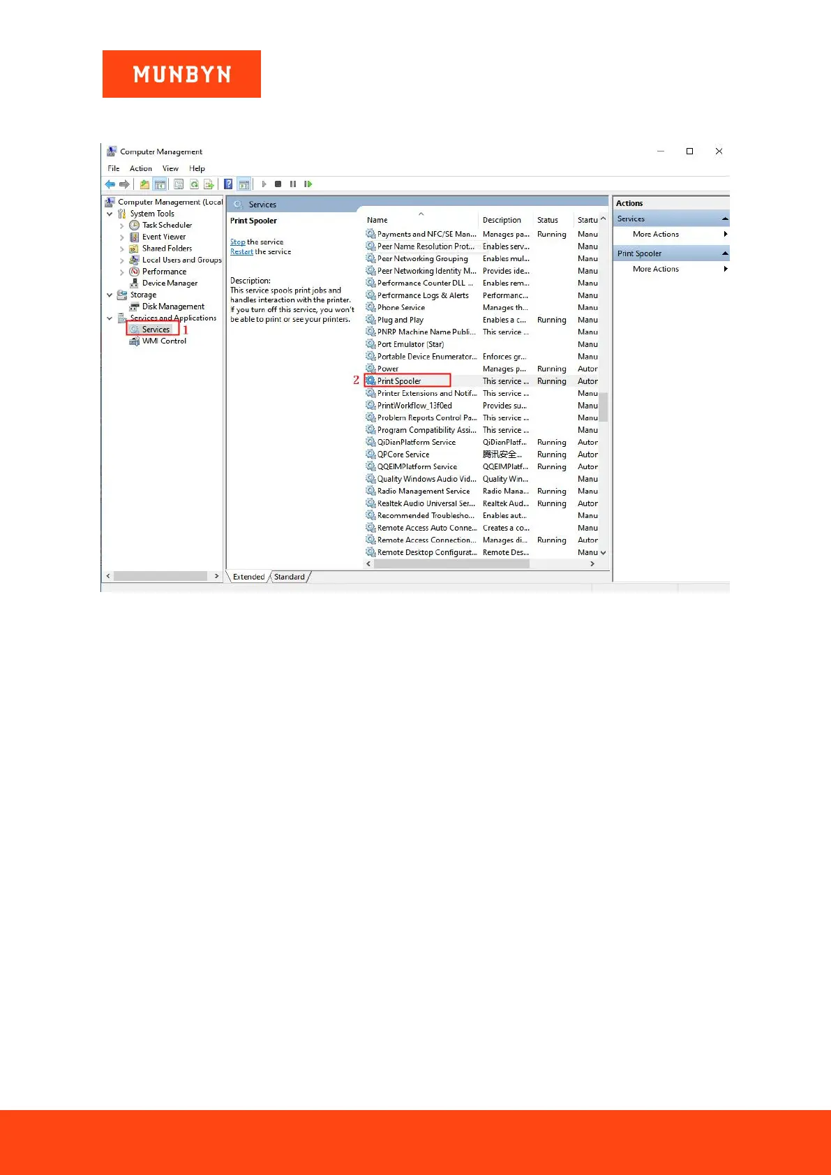 b. Click "Service", then select "Print Spooler", right-click the mouse to choose the "restart". Wait about 5