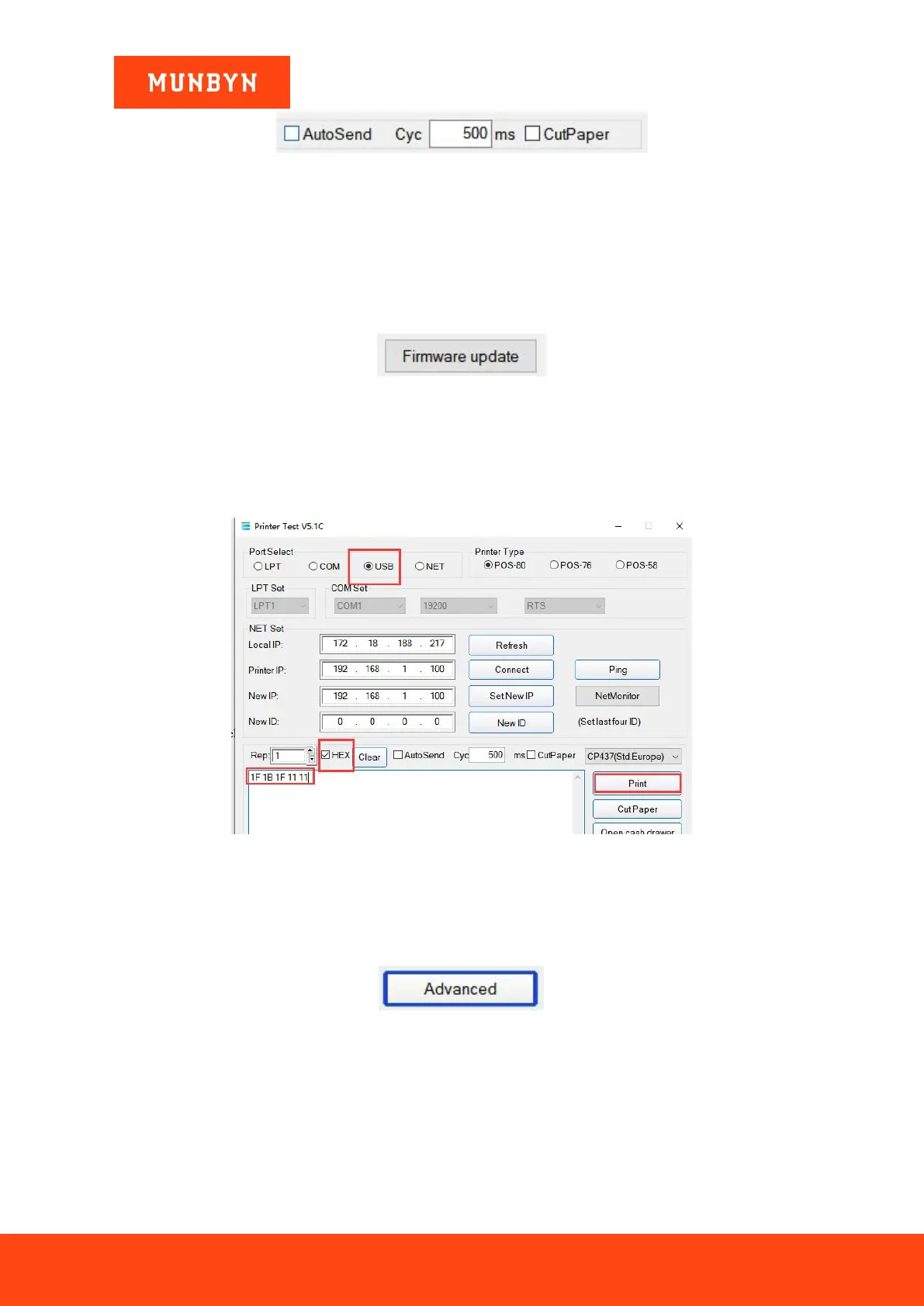 Open "Printer Test V5.1C", clear the input field and check "HEX", enter "1F 1B 1F 11 11", and click "Print".
