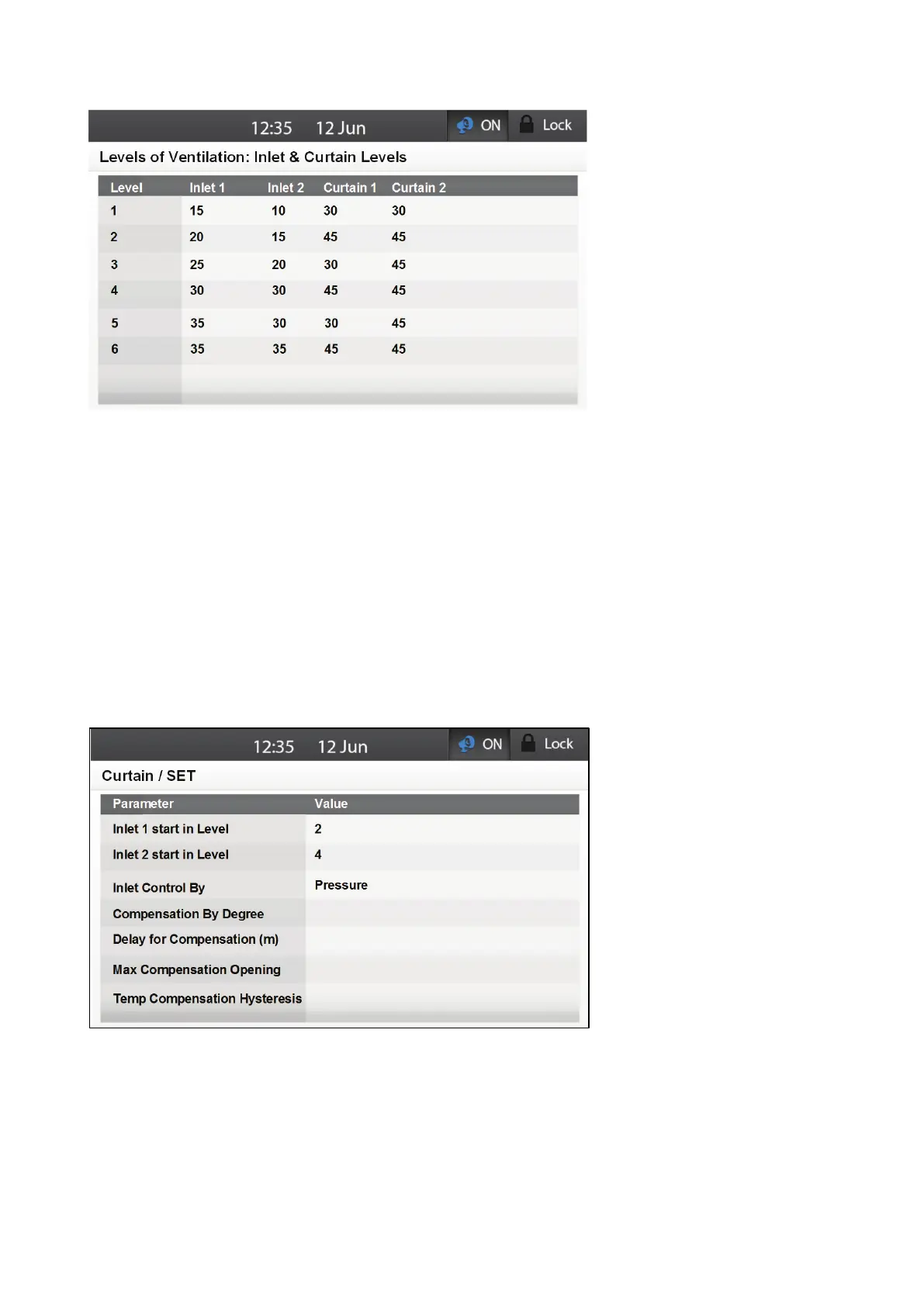 1. Go to System > Levels of Ventilation > Inlet & Curtain Levels > Set.
