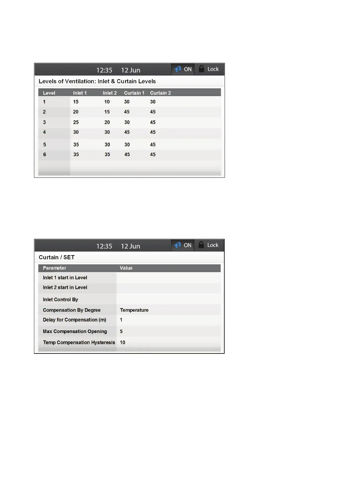 1. Go to System > Levels of Ventilation > Inlet & Curtain Levels > Set.