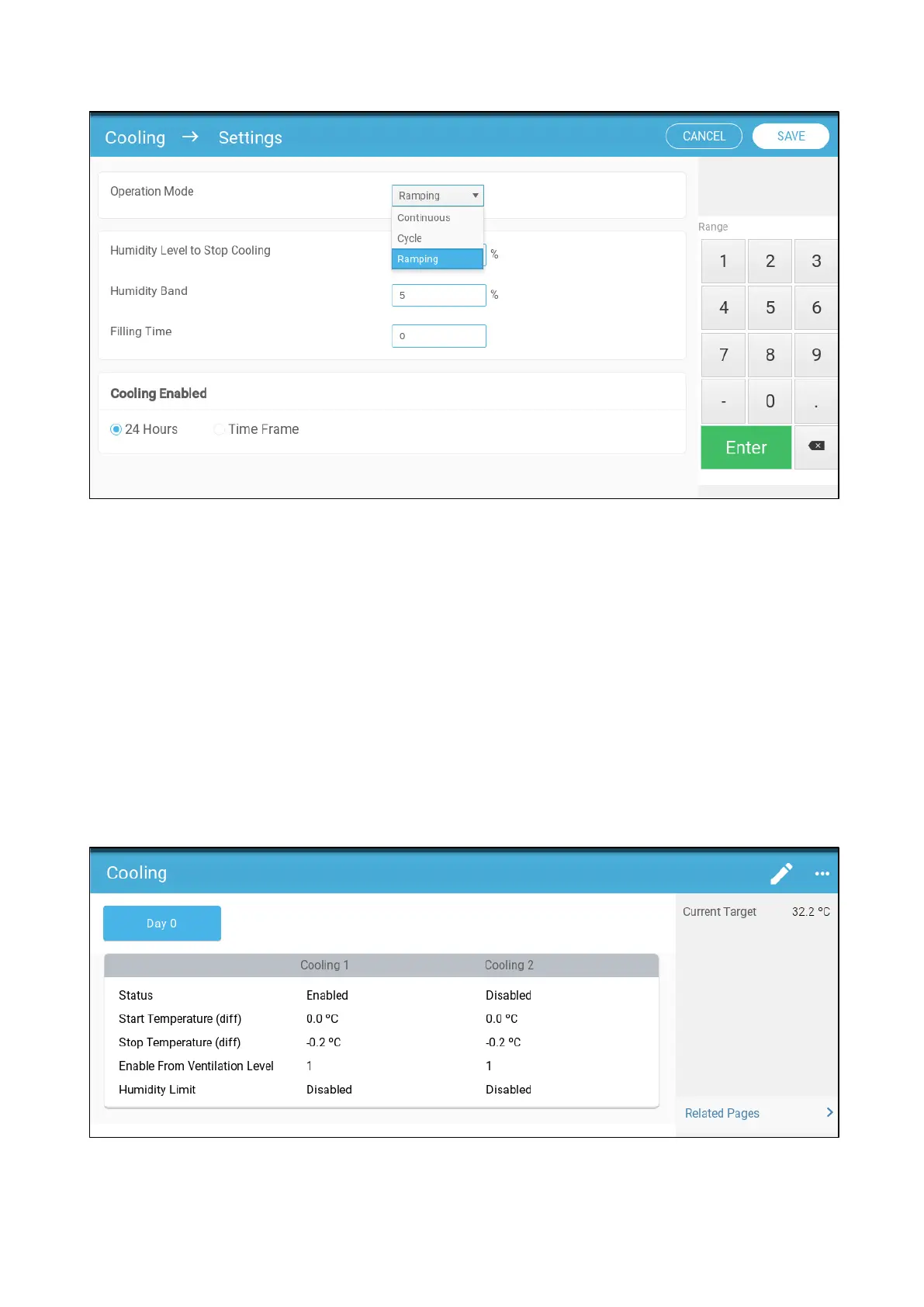 3. Go to Climate > Cooling. The screen that appears depends on the operation mode chosen.