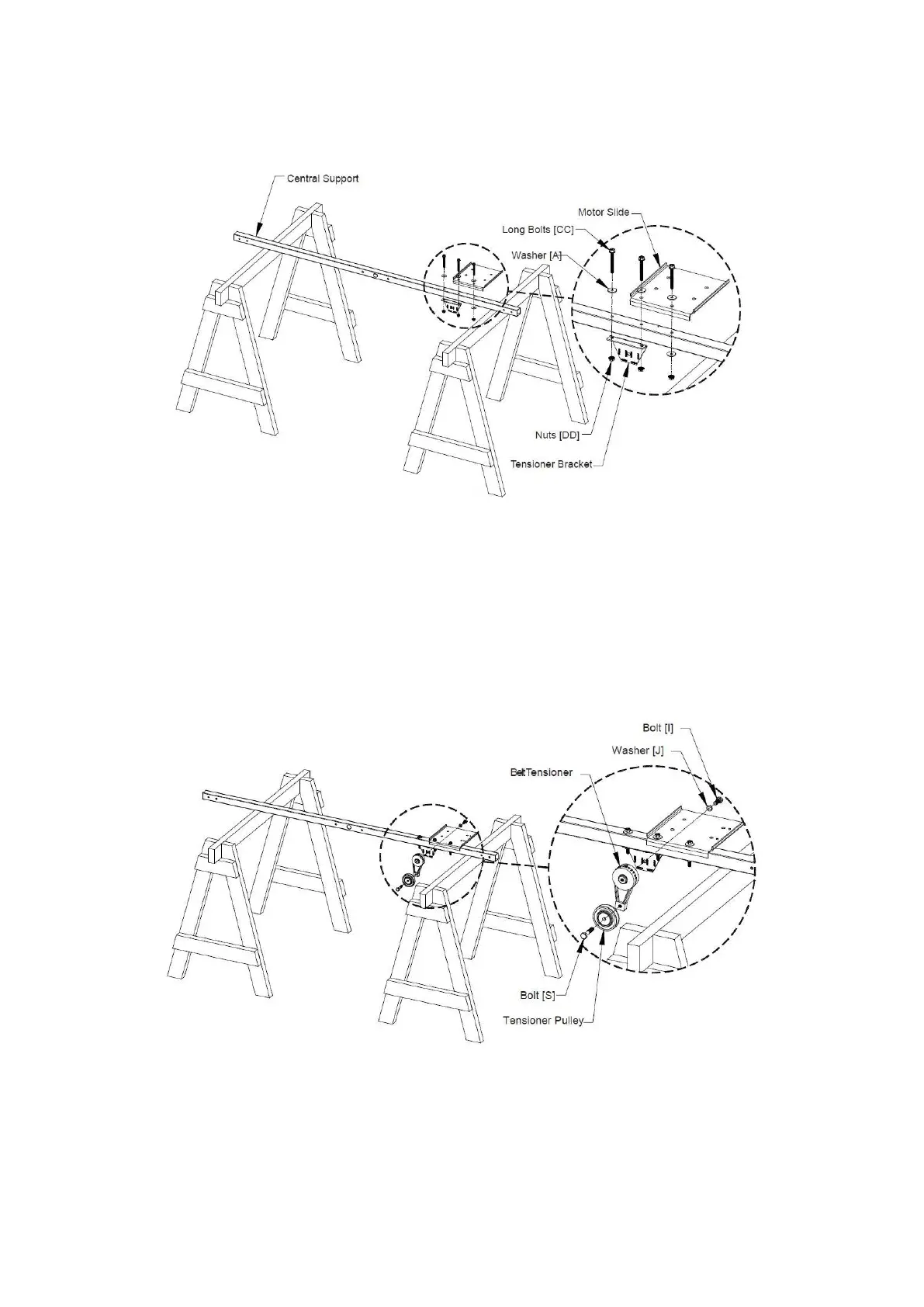 Attach the Motor Slide and the Tensioner Bracket to the Central Support using (3) Long Bolts [CC], (4) Washers [A] and