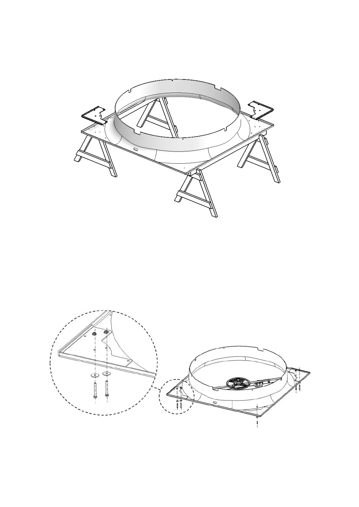 Place Fiberglass Orifice on saw horses with the round orifice pointing up and place (1) Cone/Strut Mounting Bracket in