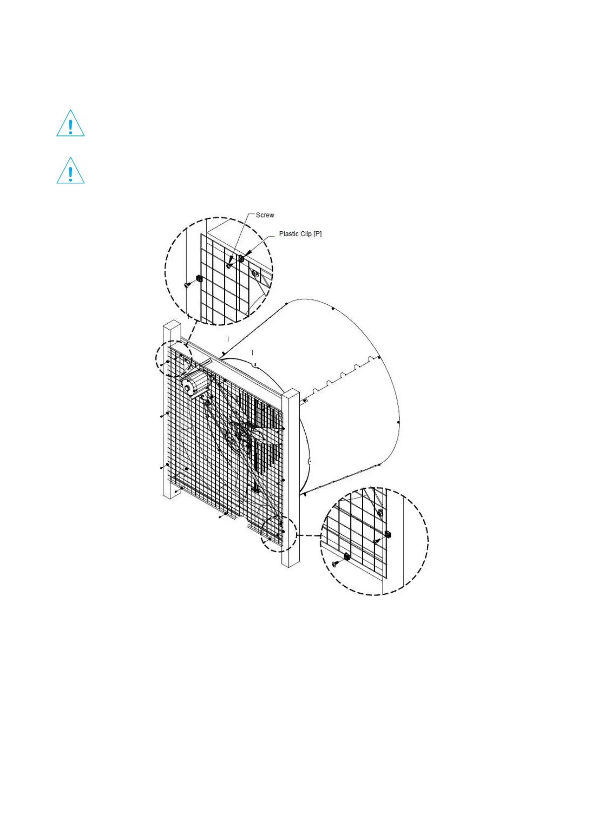 Place the mesh against the framing and fasten it in place using (12) Plastic clips [P] and proper Screws (Not Provided).