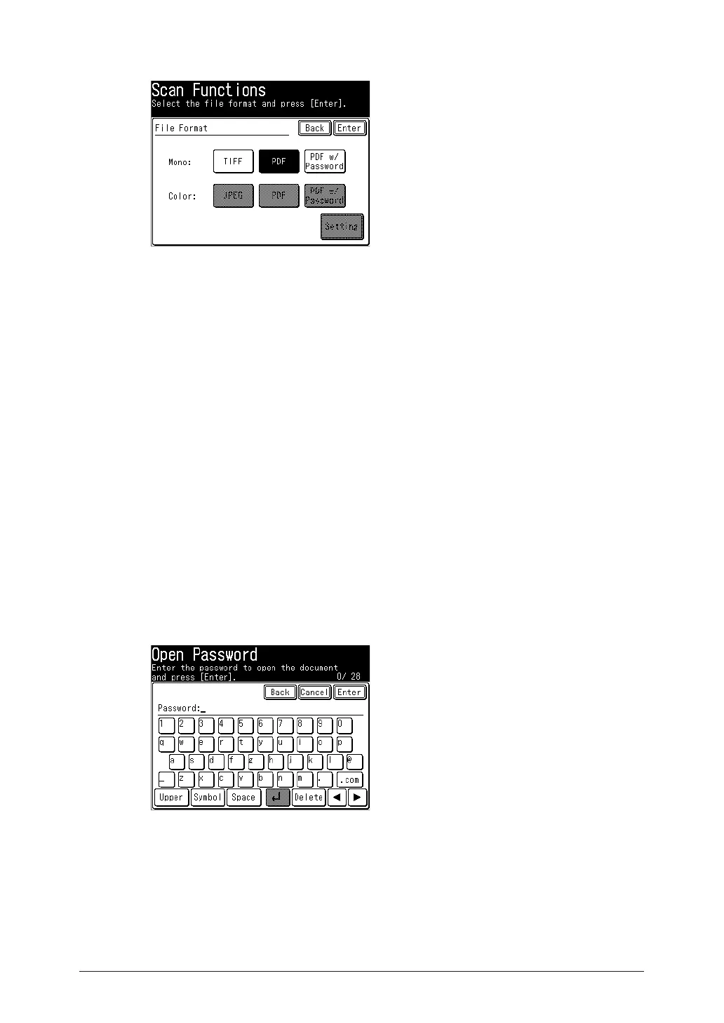 If you have selected [PDF w/Password] in step 4, press [Setting] to change the