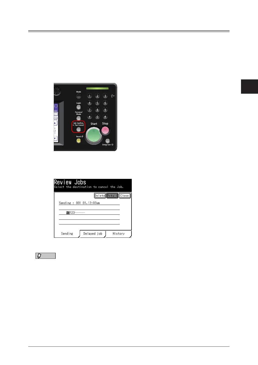 If you want to cancel the currently sending fax job, press [Delete].