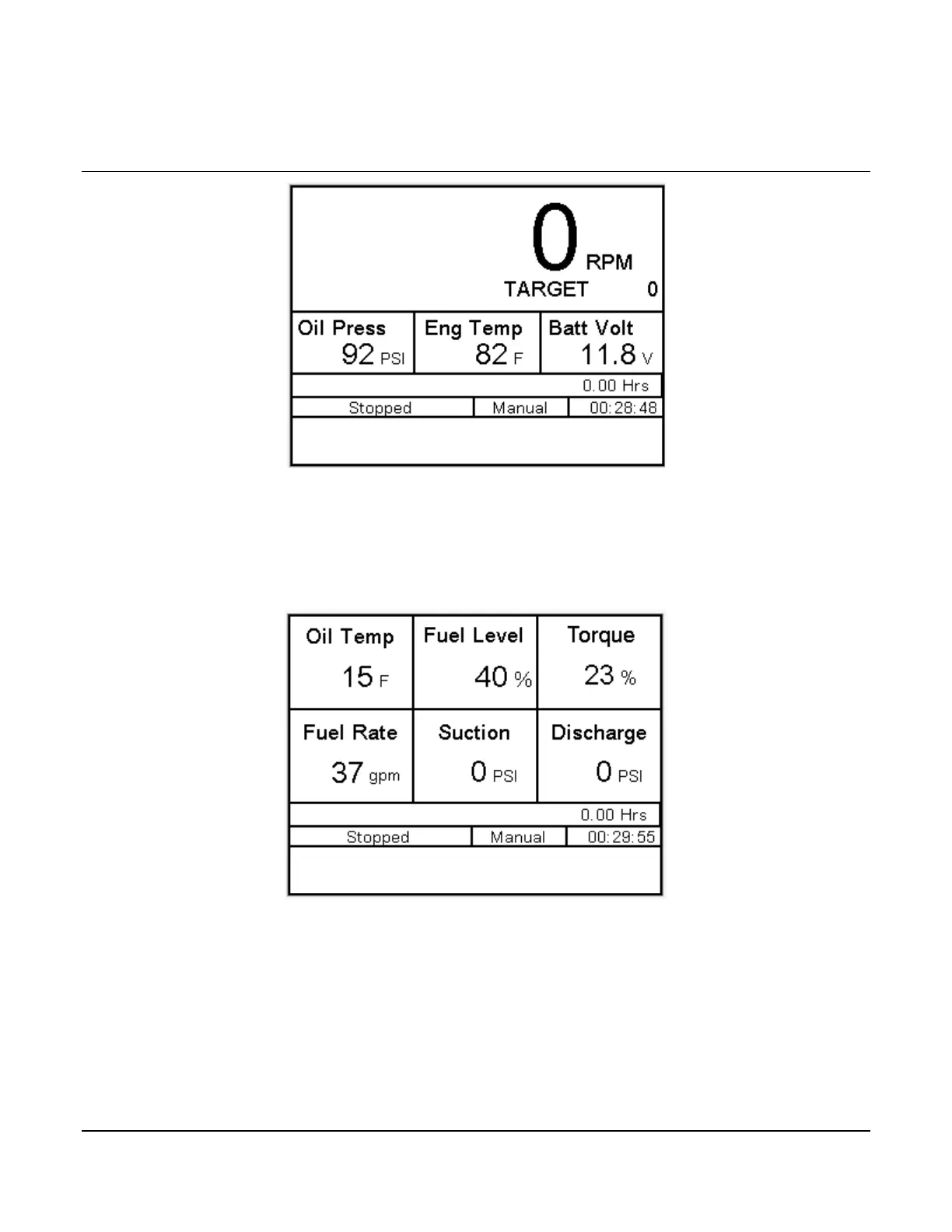 This is the main screen, and it displays actual and target RPM, Oil Pressure, Engine Temperature, Battery