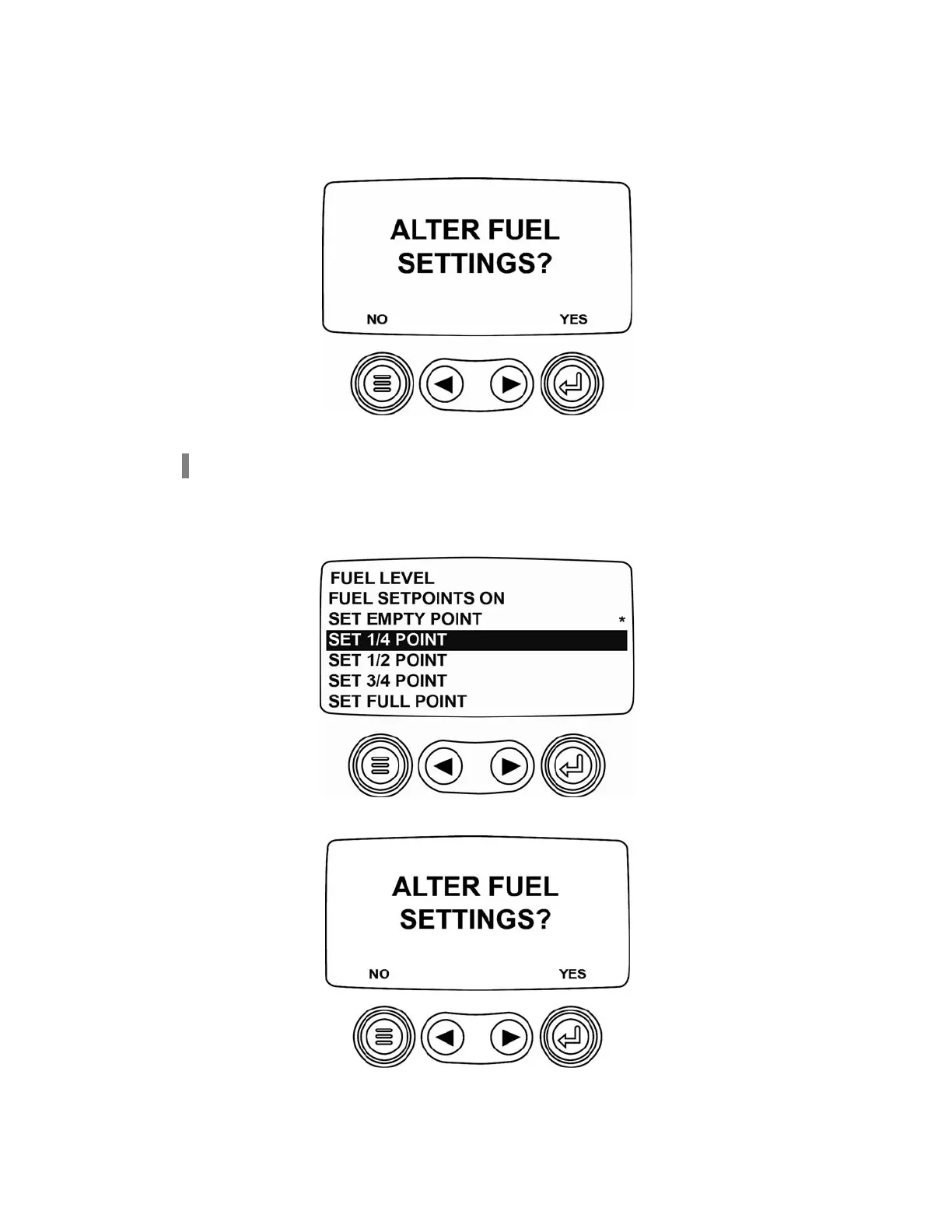 Add fuel to 25% of the tank’s capacity and select the quarter tank set the 1/4 point setpoint.