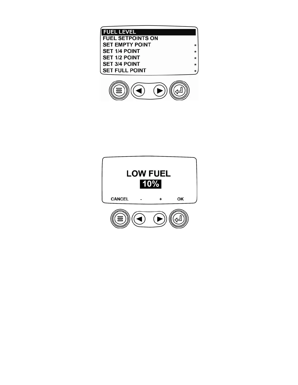 To change the Low Fuel Level setpoint, use the left and right arrows to increase or decrease the setpoint. Select