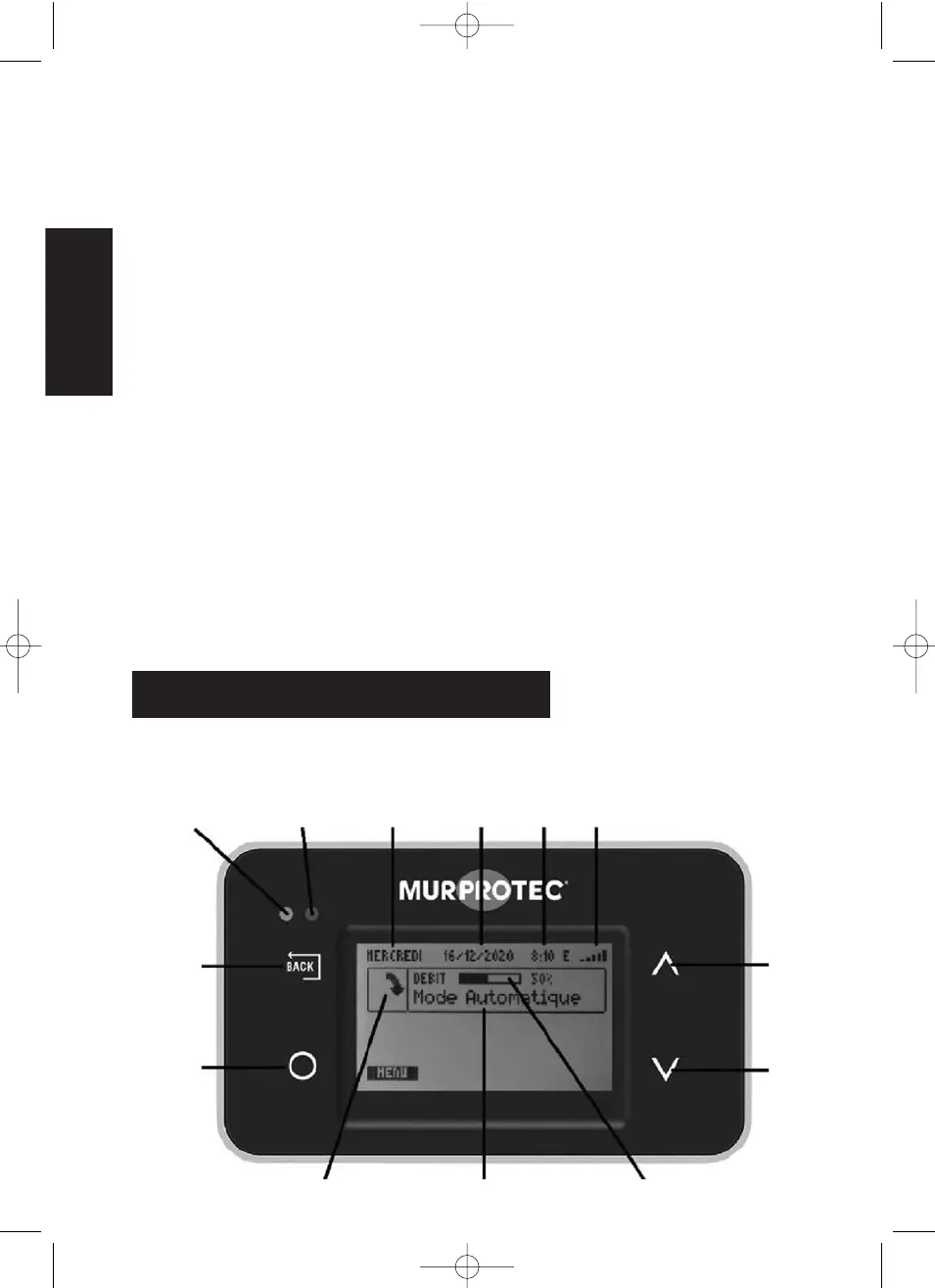 Het kastje bestaat uit 4 toetsen, 2 controlelampjes en een scherm: