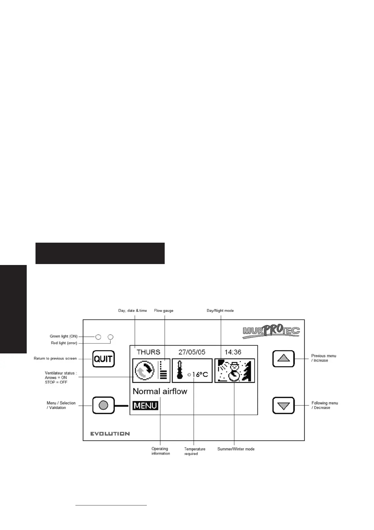 The box comprises 4 keys, 2 indicator lights and a screen :